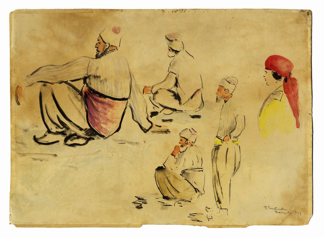 Acquerello, matita, penna e inchiostro di china su carta. mm 275x377. Firma irriconoscibile in basso a destra.
