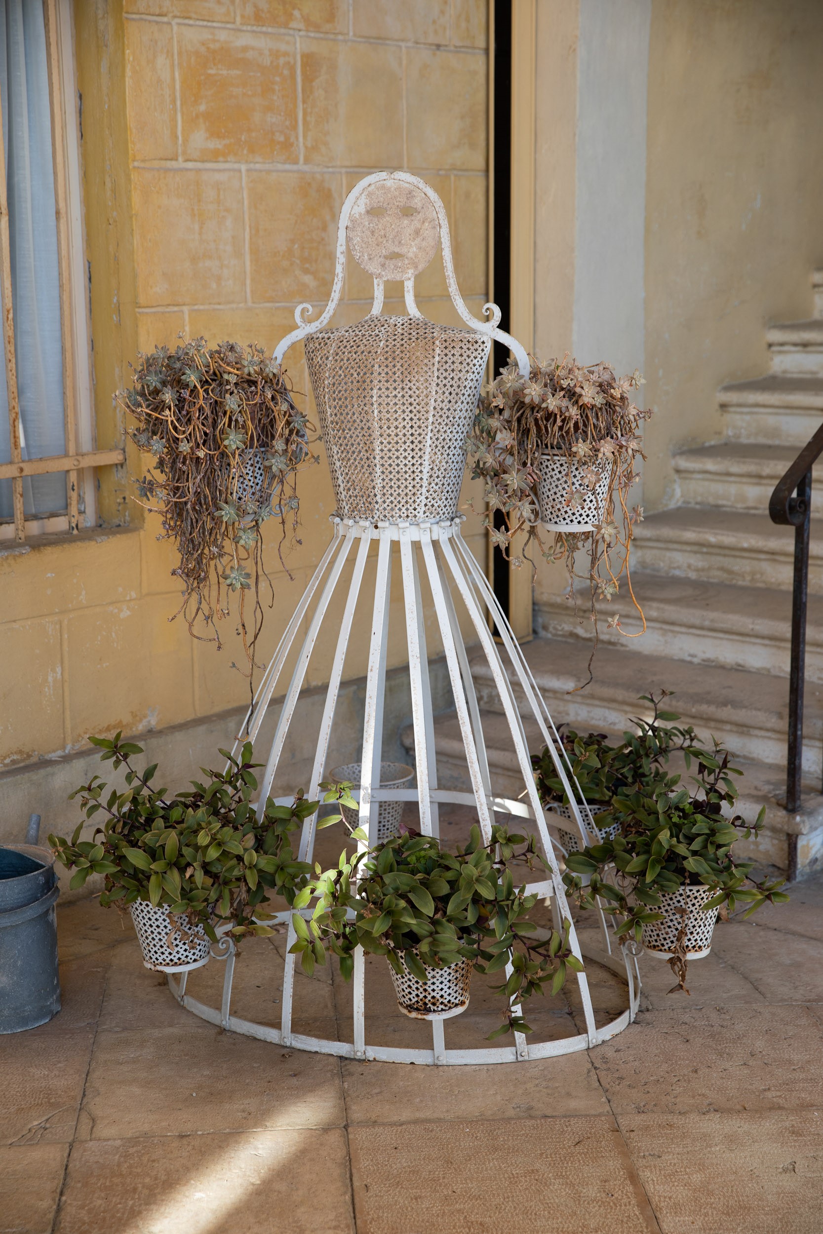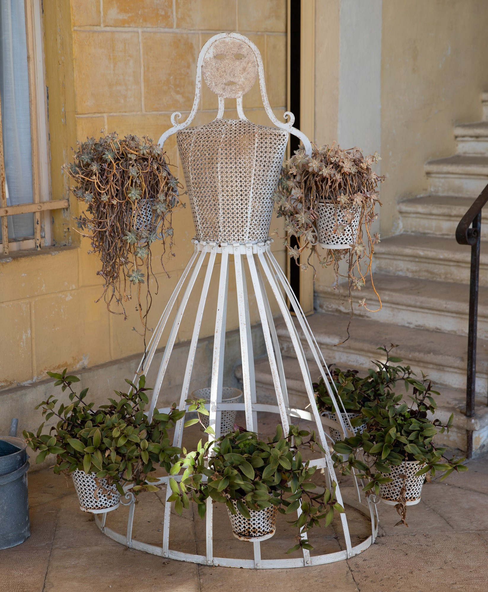 Servomuto in forma di figura femminile in ferro lavorato con portavasi in lamina traforata.