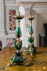 altezza cm 203, diametro cm 80 Coppia di lampade modello Arenzano Quattro Fiamme in ottone con diffusori in vetro [..]