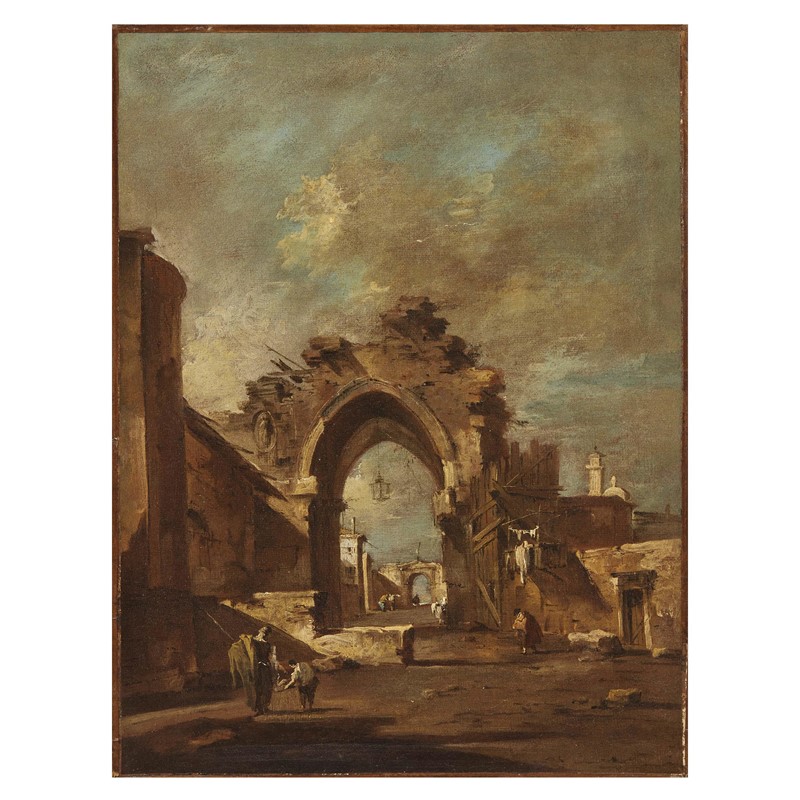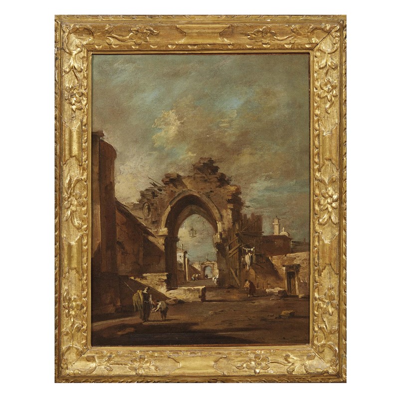 Il tema del dipinto – un arco gotico che dà accesso a un breve portico, con un arco classicheggiante, forse la porta di una cinta muraria, che si intravvede sullo sfondo a conclusione di una strada fiancheggiata da case rustiche e da una chiesa – è peraltro comune a numerosi “capricci” dipinti da Francesco Guardi fra ottavo e nono decennio del Settecento, quando l’artista veneziano inventa questa felicissima formula anche per sopperire alle crescenti richieste dei suoi estimatori: come era già stato a Roma per Gaspare Vanvitelli nella sua produzione di “vedute ideate” a partire dal secondo decennio del Settecento e in misura maggiore negli anni Venti, i capricci guardeschi accostano motivi dal vero ad altri di invenzione o tratti da un diverso contesto, restituendo una visione ideale, e per l’appunto arbitraria e stravagante, di un paesaggio urbano evocativo ma di pura invenzione.