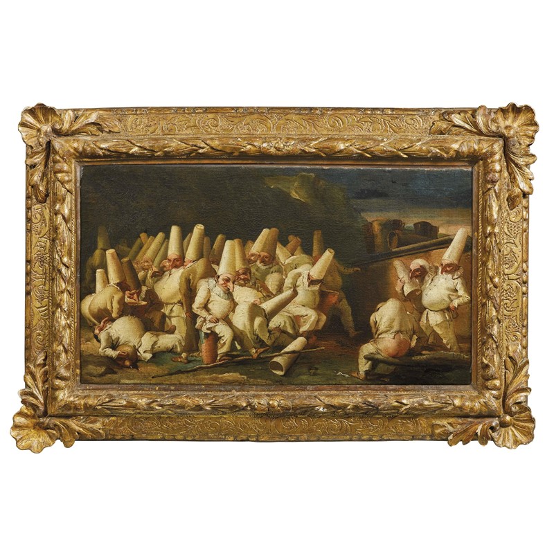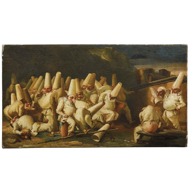 L’attribuzione si sostanzia proprio grazie ai menzionati legami dell’opera ex Broglio con i disegni di Giambattista, così come appartengono a Giandomenico decisivi stilemi pittorici: dai peculiari ammassamenti dei personaggi che si risolvono in una folla indistinta, alla consueta pennellata tremula e addensata nelle biacche, accordata su gamme luminose mai troppo accese e stretta da una linea di contorno nervosa e più marcata rispetto a quella del padre, ritrovabile pure nella sua condotta grafica, per esempio nel foglio del museo Atger di Montpellier con Tre Pulcinella, in cui quello accasciato a terra, sopra l’iscrizione vergata presumibilmente dallo stesso Giandomenico, si apparenta con il simile a fianco del Pulcinella assiso sulla pentola del dipinto in esame.