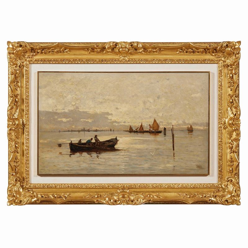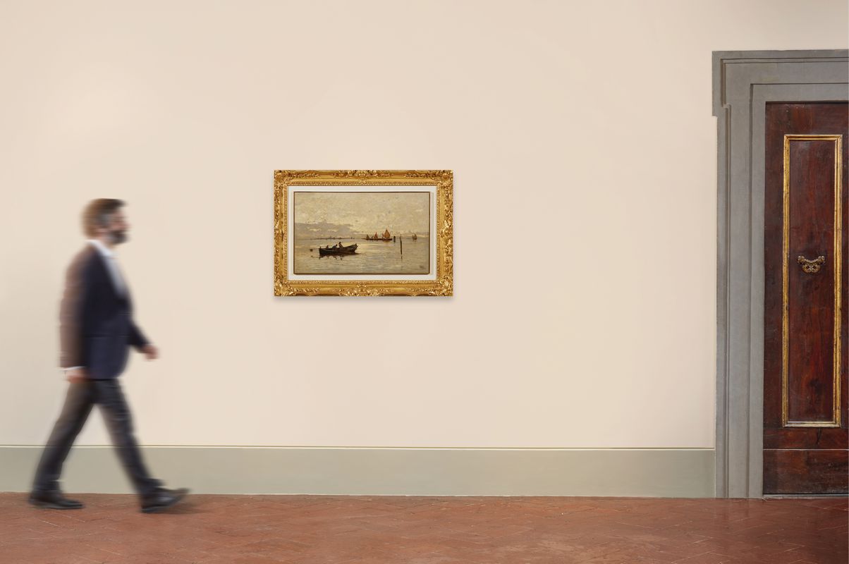 Guglielmo Ciardi (Venezia 1842 - 1917) PESCATORI (LAGUNA DI CHIOGGIA) olio su tela, cm 46,5x79 retro: cartiglio iscritto Ciardi Guglielmo/ Soggetto: 'Pescatori (Laguna di Chioggia)/ Prezzo L. 600