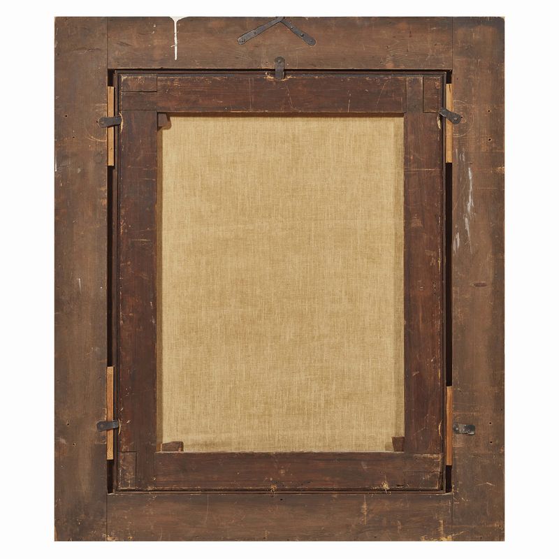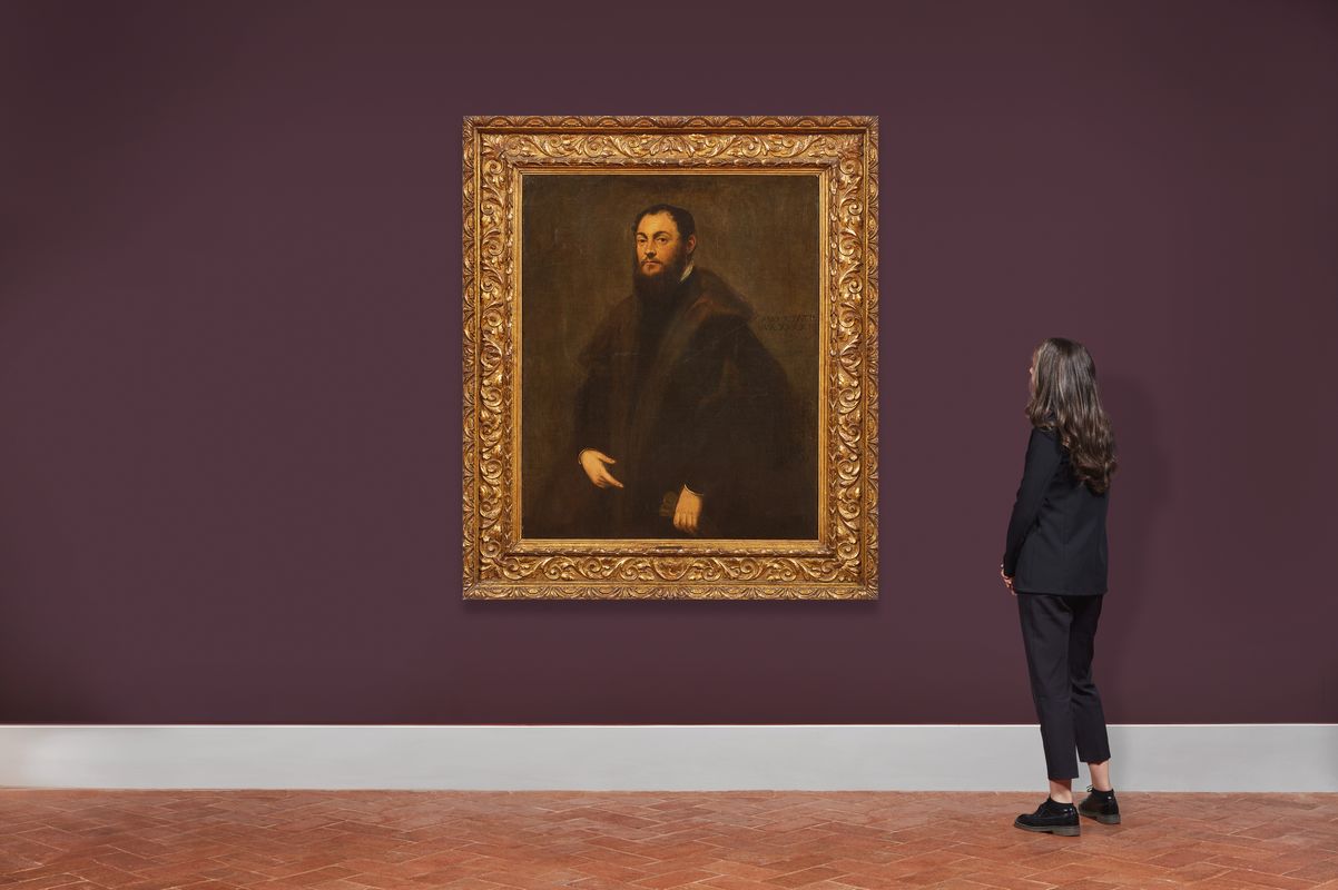 Questo bel ritratto, tutto giocato su un affascinante equilibrio di toni scuri e dorati – cifra distintiva del maestro veneziano – raffigura un uomo dai capelli e folta barba nera, e i baffi appena accennati, ancora memori dell’età giovanile che traspare anche dal leggero rossore delle gote. L’uomo è raffigurato in abiti di un’eleganza sobria e contenuta, che solo fugacemente si illumina nell’accenno di camicia bianca sopra la pelliccia che avvolge le spalle e ricade sulla veste nera. Le maniche lasciano appena intravedere due svelte linee bianche sui polsi; la mano sinistra stringe i guanti appena sfilati.