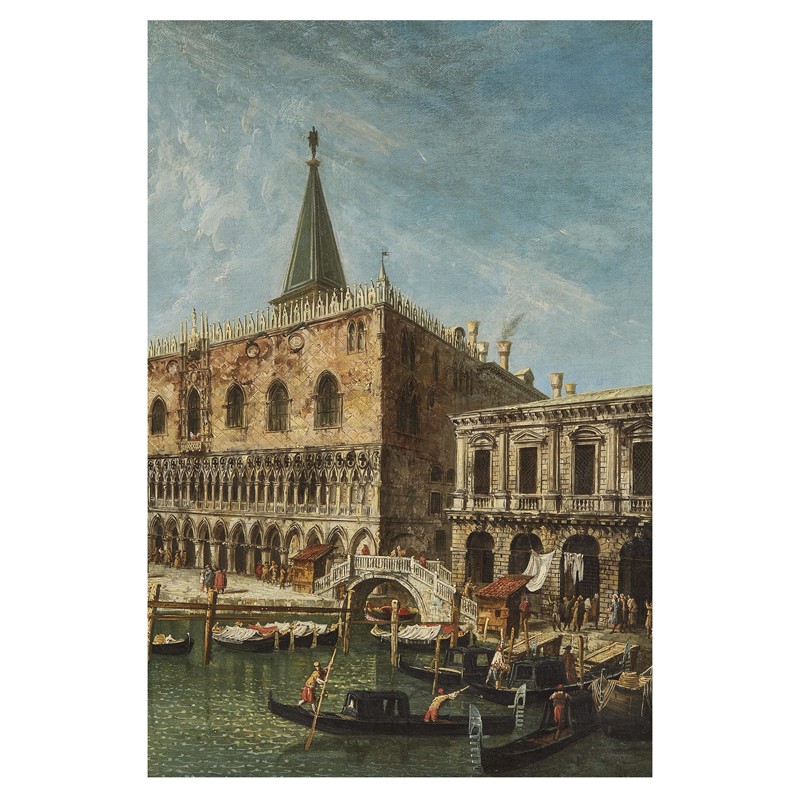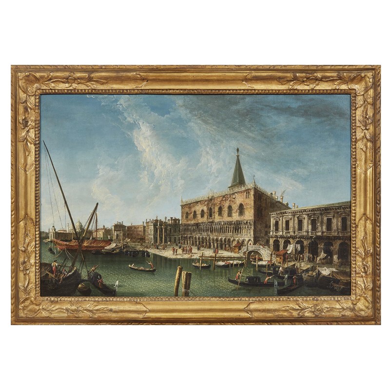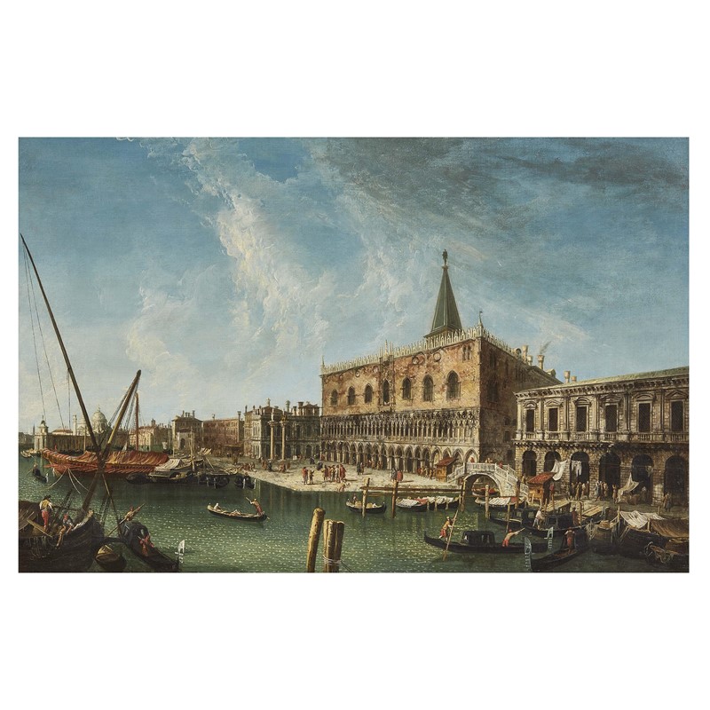 Presa dal bacino di San Marco e con la accentuata dilatazione prospettica caratteristica del pittore, la veduta include, procedendo da destra, le Carceri, il Palazzo Ducale da cui emerge il campanile di San Marco, le ultime campate della Marciana al di là delle colonne gemelle, e si spinge fino a comprendere gli edifici dei Granai e il Fontegheto della Farina. Più oltre, l’imbocco del Canal Grande con la chiesa della Salute e la punta della Dogana; appena visibile, all’estremità dell’inquadratura, l’isola della Giudecca.