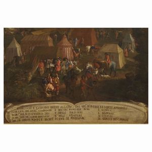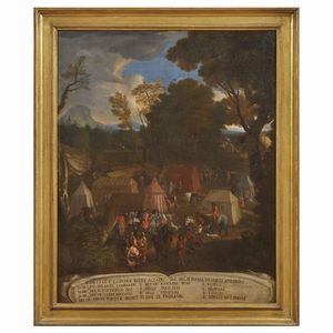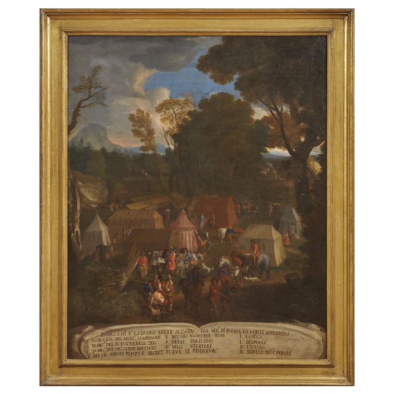 Intitolato Padiglioni e capanne fatte alzare dal Ser.mo Duca di Parma ne’ Monti Appennini il cartiglio apposto alla base della nostra veduta – vera e propria legenda della scena raffigurata – ne designa la destinazione e l’uso contrassegnando con lettere maiuscole le singole tende e specificando i nomi degli occupanti.