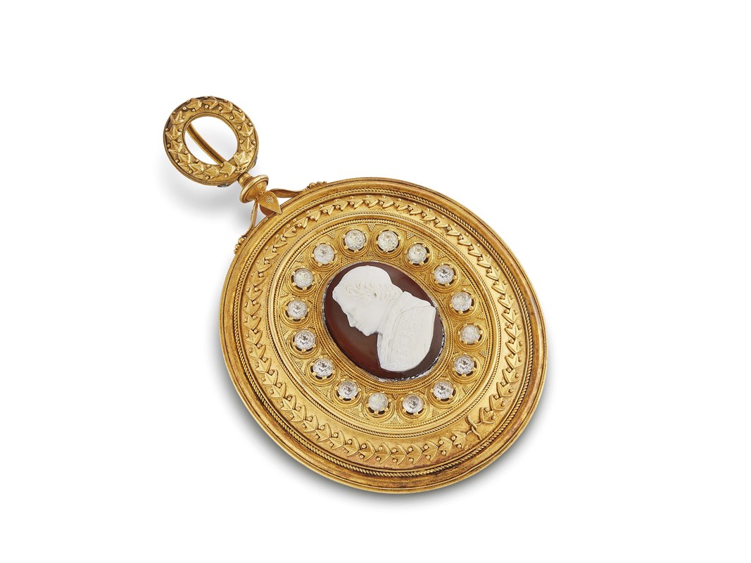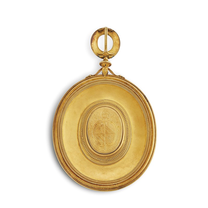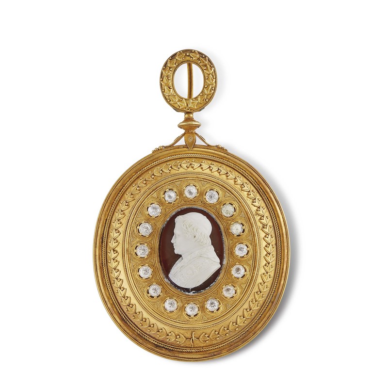in oro inciso e in filigrana, con al centro un cammeo in corniola raffigurante Sua Santità Papa Pio IX, circondato da una fila di pietre incolore e ghirlande stilizzate a rilievo, reca sul retro inciso lo stemma della famiglia Mastai Ferretti a cui apparteneva sua Santità, mm 90X68, gr 105. Corredato di cartiglio in cui viene riportato come segue: regalato da S. Santità Pio IX alla Contessa Giulia Guicciardini Pucci, nell'occasione della sosta che fece Santità Sua il 18 Agosto 1857 nella Villa Guicciardini a Montughi.