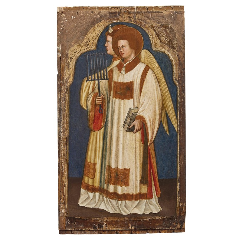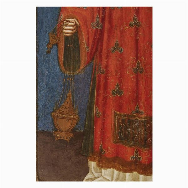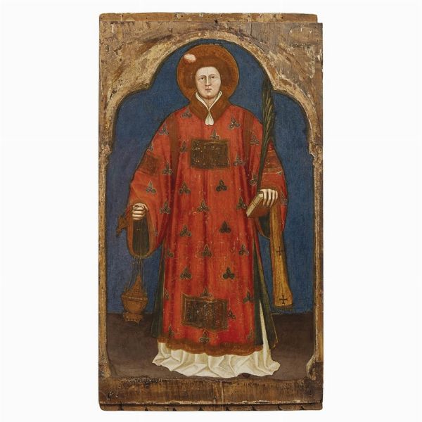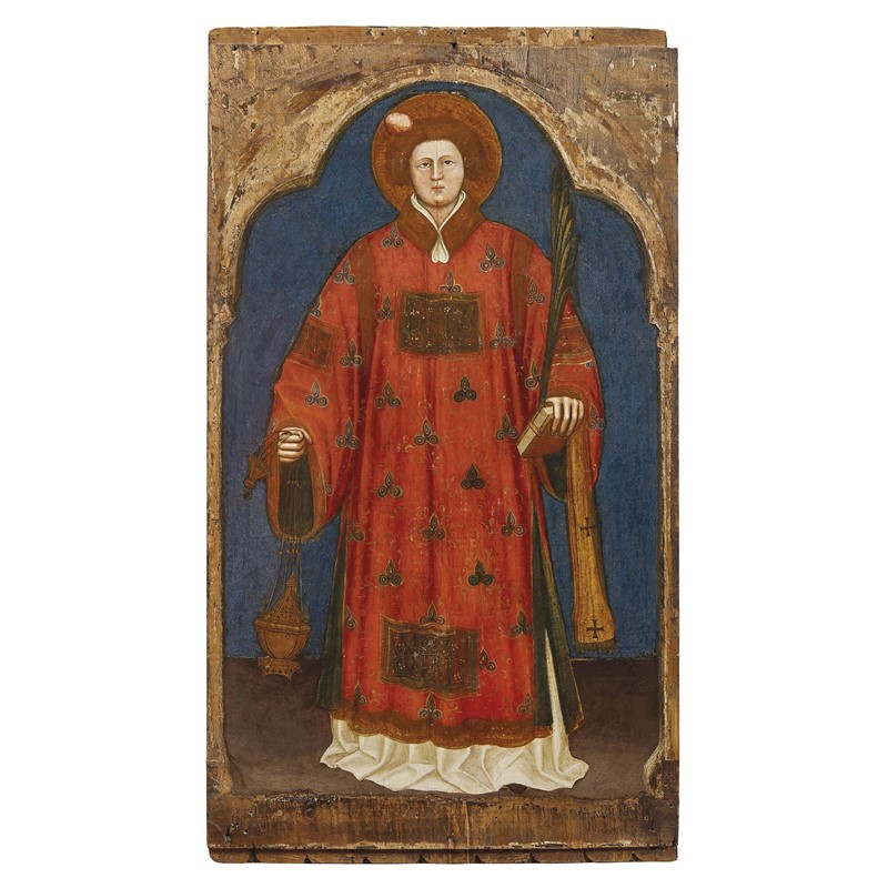 La posizione in netto profilo di Prosdocimo, che guarda verso destra, assicura sul fatto che la tavola costituiva il laterale sinistro di una pala d’altare smembrata di dimensioni contenute. A questo dipinto infatti ho avuto modo di collegare in passato altri due scomparti, che più tardi sono felicemente confluiti nella stessa collezione, consentendo così di recuperare l’unità del complesso originario. Le due tavole raffigurano rispettivamente Santo Stefano in sgargiante dalmatica rossa, con turibolo, libro, palma e sulla testa la pietra, strumento del martirio, e San Lorenzo in elegante veste diaconale bianca, che regge una piccola graticola, suo consueto attributo iconografico, e un Angelo, forse Michele, dalle lunghe ali bianche.