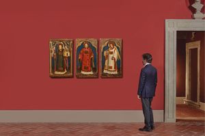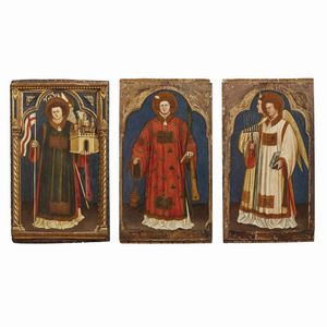 tre dipinti a tempera su tavola, cm 88,5x53; 90x49,5; 90x49,5