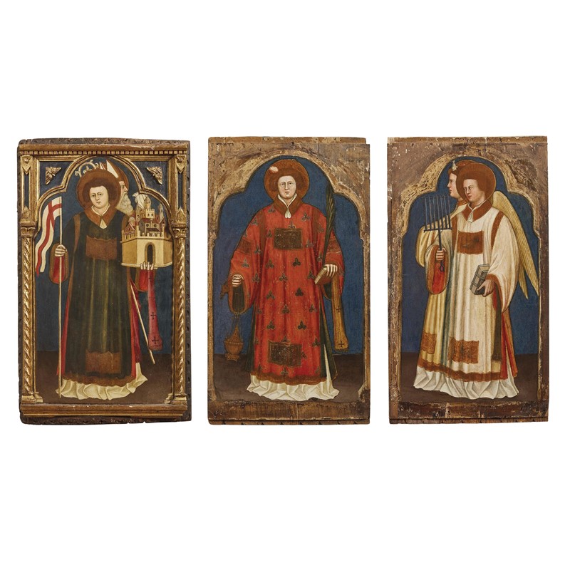 La comune provenienza di queste tre tavole da un unico complesso è garantita dallo stesso punto di stile, dalle dimensioni identiche (San Daniele e Prosdocimo 88 x 53 cm; Santo Stefano 89 x 50 cm; San Lorenzo e un Angelo 89 x 50 cm), come pure dalle profilature del tutto simili degli archi che scandiscono ciascun scomparto e inquadrano i personaggi - dai volti gemelli, floridi e larghi - che si stagliano dinanzi a un analogo fondo azzurro e poggiano su di una striscia di terreno, similmente scorciato, che corre in continuità in tutte le tavole.