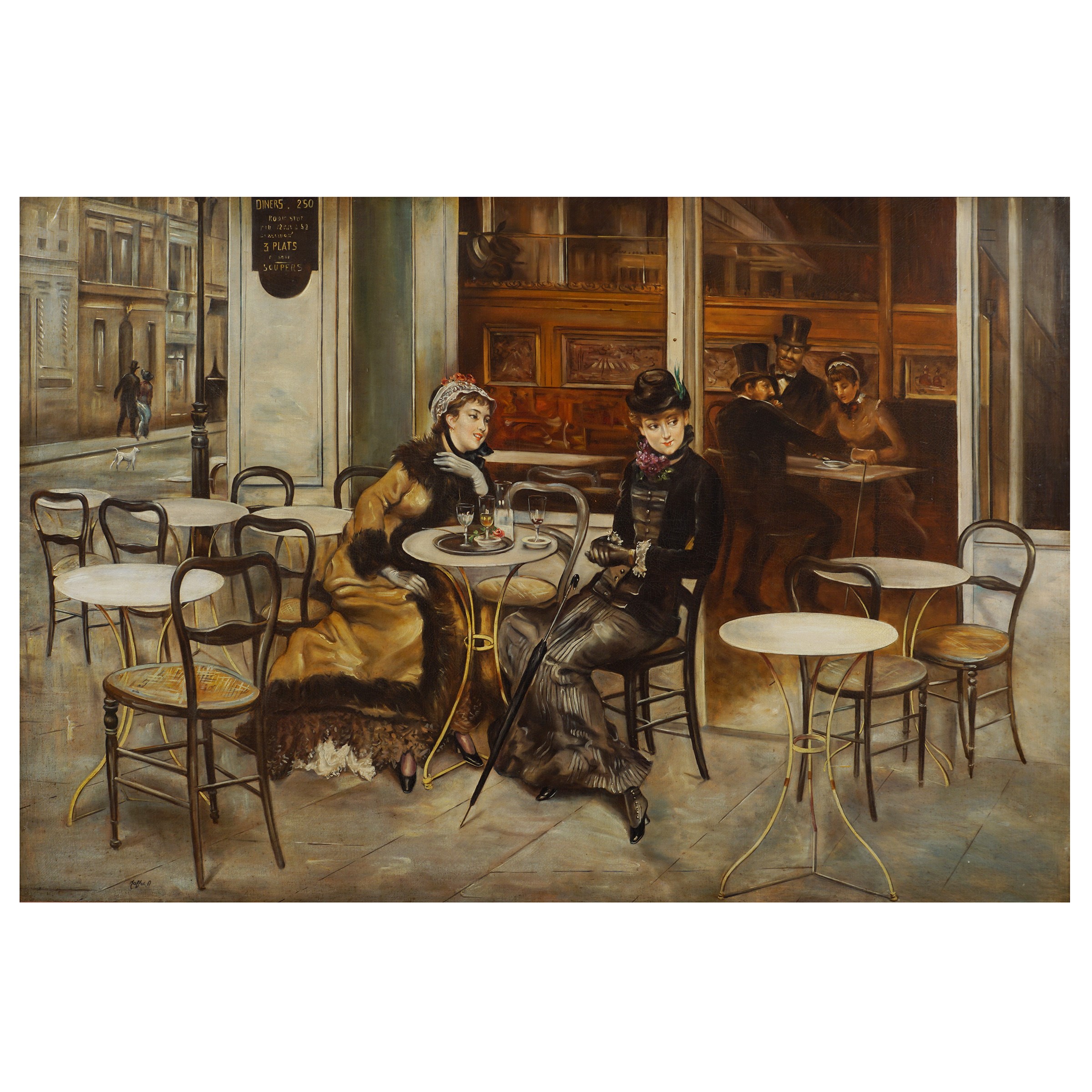 Italia XX Sec. Conversazione al caffè di due giovani signore, olio su tela, copia da Giovanni Boldini, firmato in basso a destra