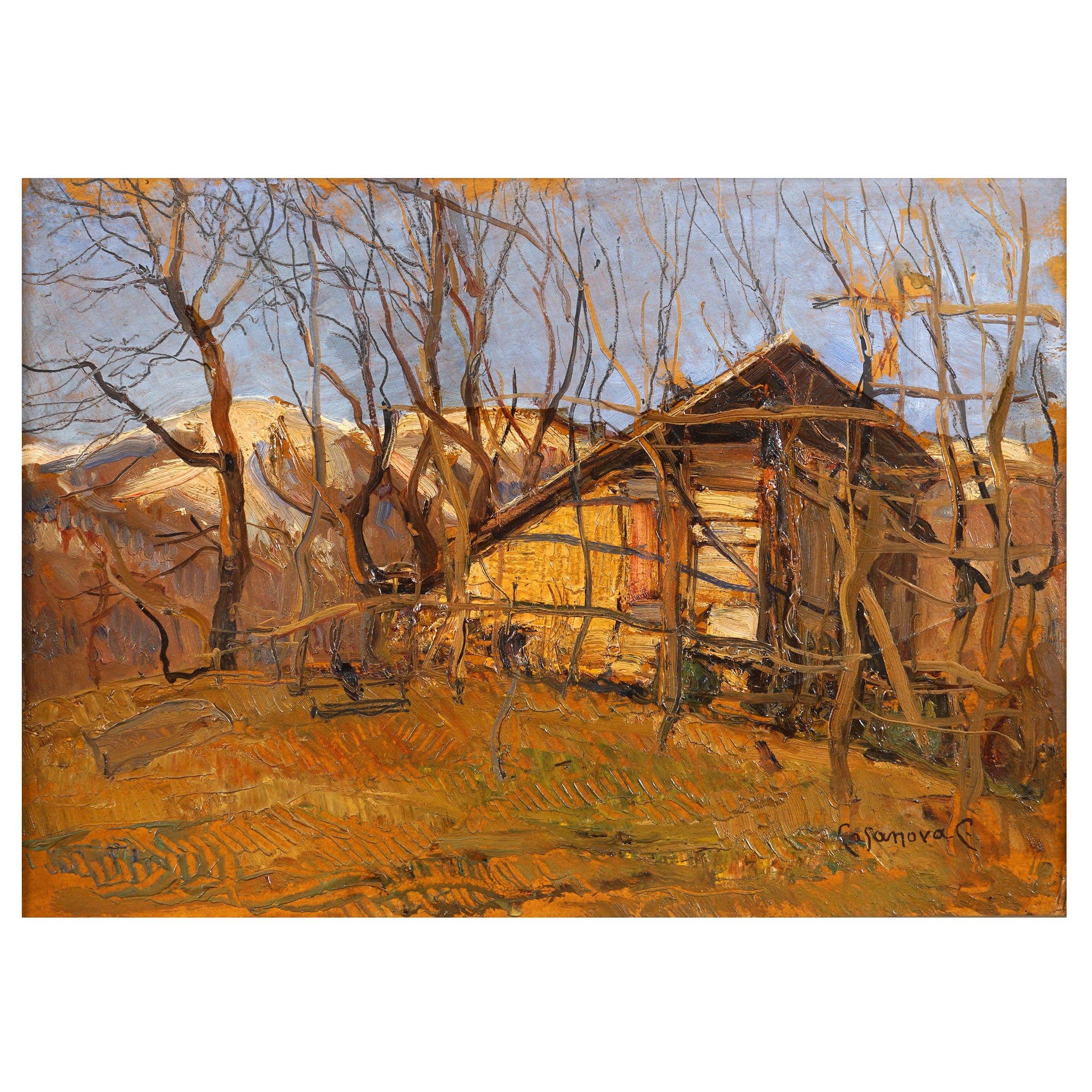 Crema 1871- Quarna Sotto 1950 Baita di montagna, olio su tavola, firmato in basso a destra, datato 1935 sul retro