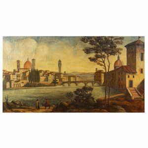 100x181 cm. XIX-XX Sec. Veduta dell'Arno-Firenze, olio su tela, entro cornice