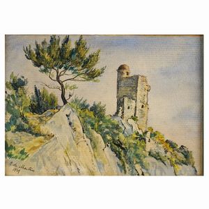 25x34 cm. XX Sec. Paesaggio con torre, acquarello, firmato e datato 1939 in basso a sinistra