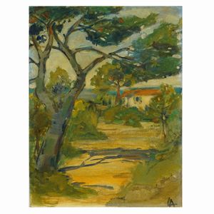 40x30 cm. XX Sec. Paesaggio, olio su cartoncino telato, siglato L A in basso a destra