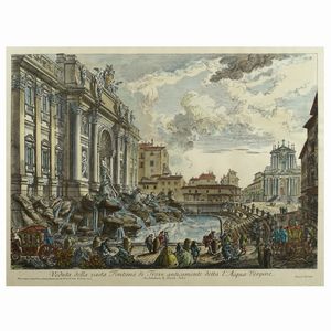 73x92 cm. XX Sec. Veduta della vasta Fontana di Trevi anticamente detta l'Acqua Vergine, da incisione di Pira [..]