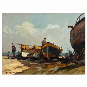 15x20 cm. Prussia 1921 - Napoli 2003 Barche con pescatori, olio su tavola, firmato in basso a sinistra
