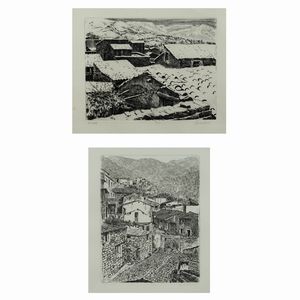 50x70 - 70x50 cm. Sassari 1931 Nevicata - Case vecchie, 1976, due acqueforti, firmate in basso a destra