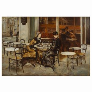 100x150 cm. Italia XX Sec. Conversazione al caffè di due giovani signore, olio su tela, copia da Giovanni Boldini, [..]