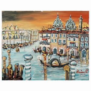 80x134 cm. Jesi 1897 - Milano 1942 Veduta di Venezia, olio su masonite, firmato in basso a destra