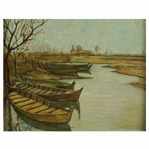 39,5x50 cm. Italia, XX Sec. Barche, olio su tavola, firmato e datato 1960 in basso a sinistra