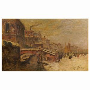 70x100 cm. Italia XX Sec. Venezia, 1928, olio su tela, firmato e datato in basso a destra, difetto