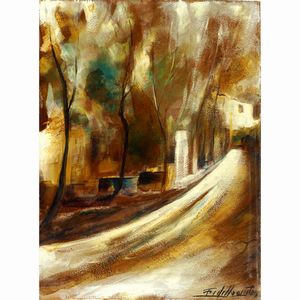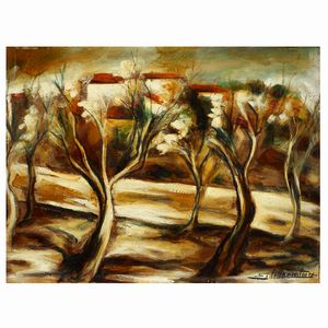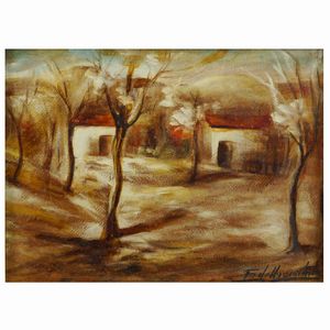 30x40 cm. Italia, XX Sec. Paesaggio con alberi e casolari, olio su cartone, firmato in basso a destra, datato [..]