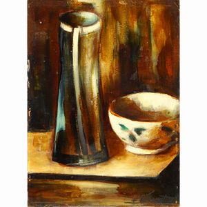 41x30,5 cm. Italia, XX Sec. Natura morta brocca e terrina,olio su cartone, firmato in basso a destra, firmato, [..]