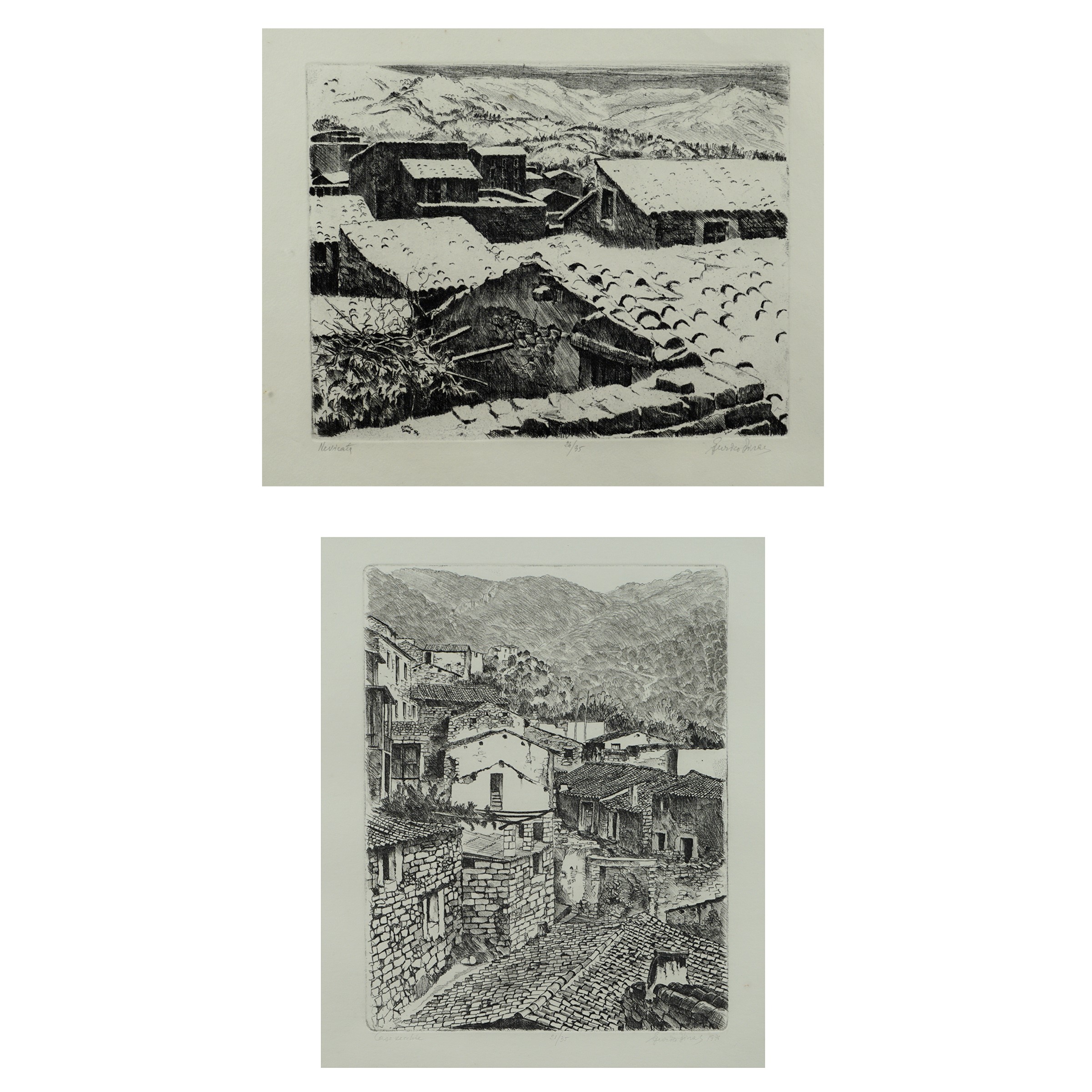 Sassari 1931 Nevicata - Case vecchie, 1976, due acqueforti, firmate in basso a destra