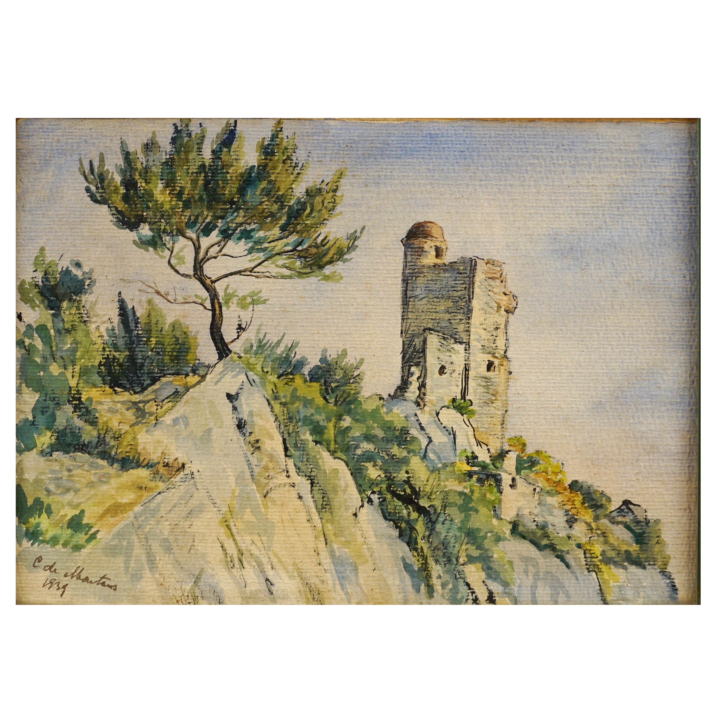 XX Sec. Paesaggio con torre, acquarello, firmato e datato 1939 in basso a sinistra
