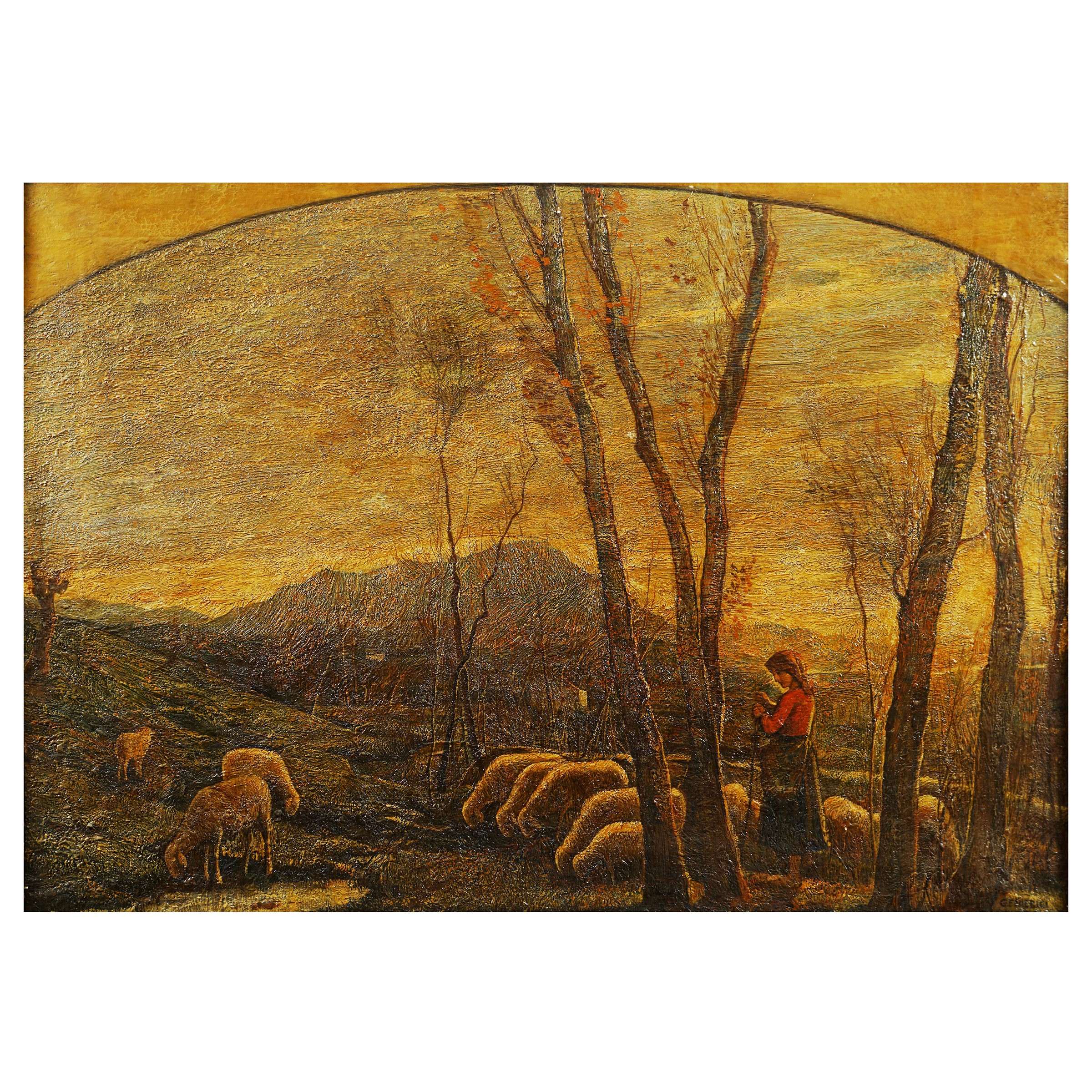 Milano 1888 - 1973 Pastorella con gregge, olio su tela, firmato in basso a destra