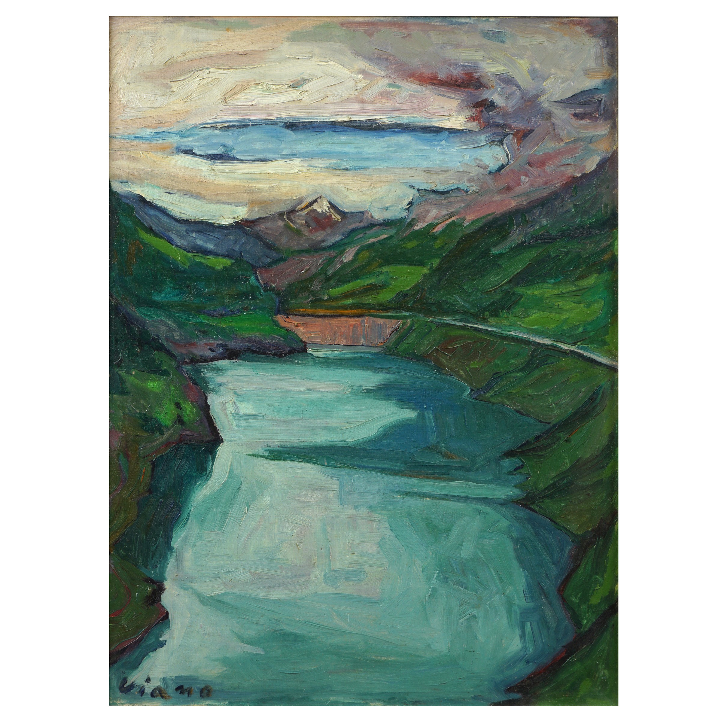Genova 1910 -1990 Paesaggio con diga, olio su tela, firmato in basso a sinistra