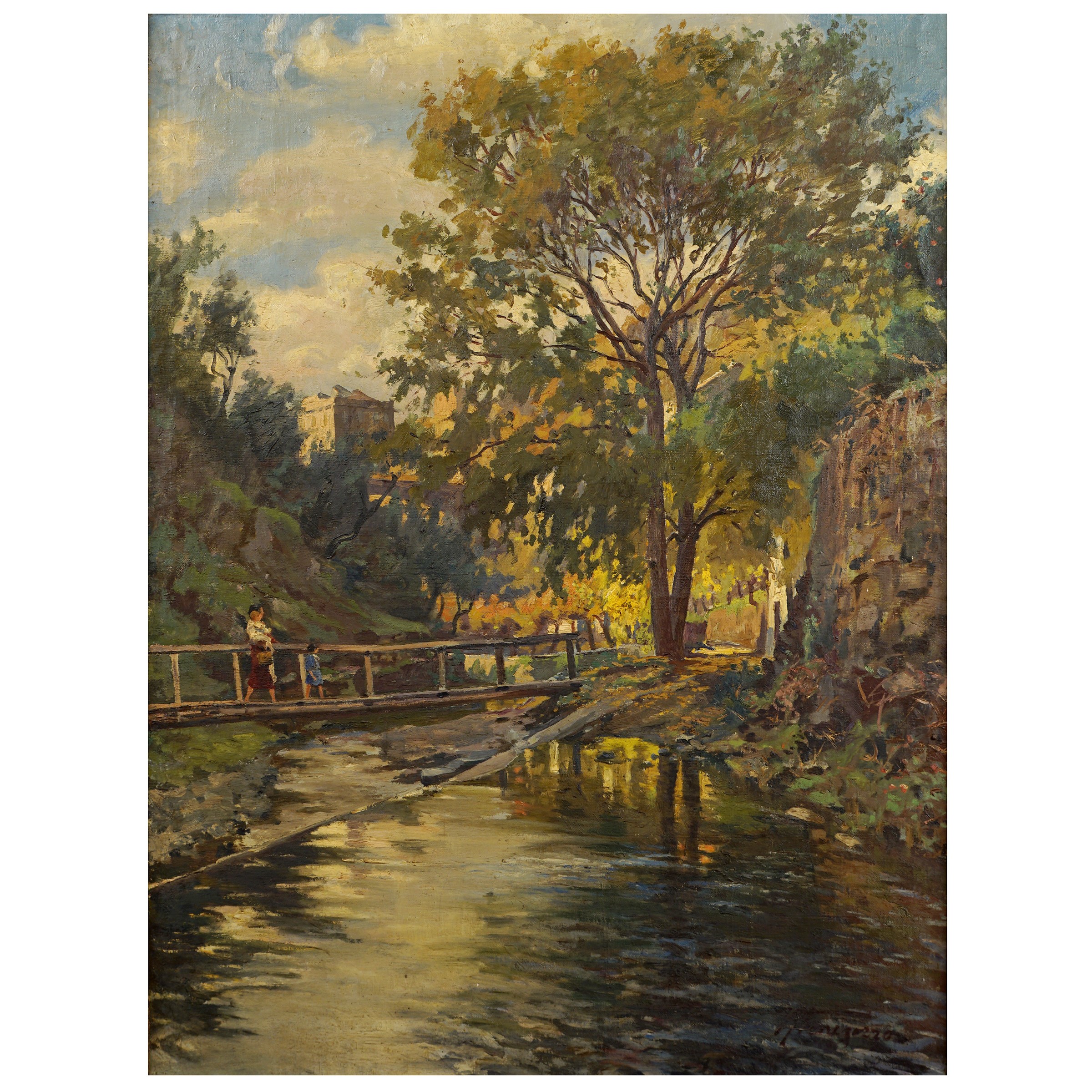 Venezia 1886 - Biella 1974 Passerella sul torrente, olio su tela, firmato in basso a destra