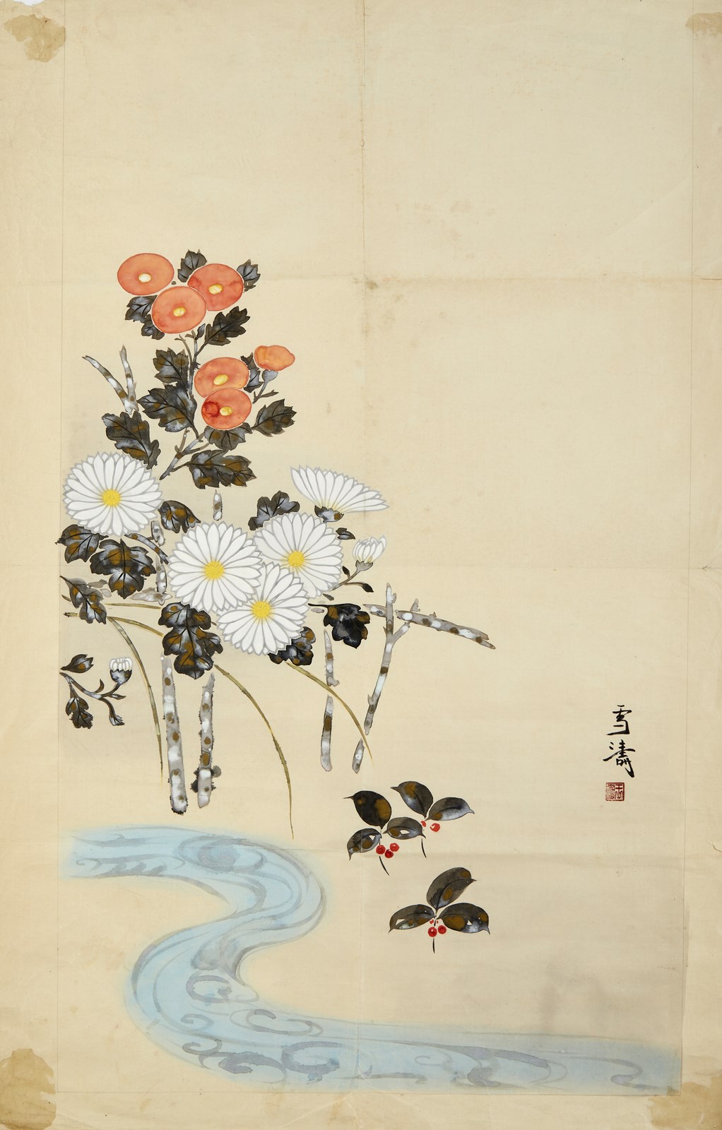 Rotolo verticale entro cornice, inchiostro colorato su carta, raffigurante fiori in prossimità di un ruscello.