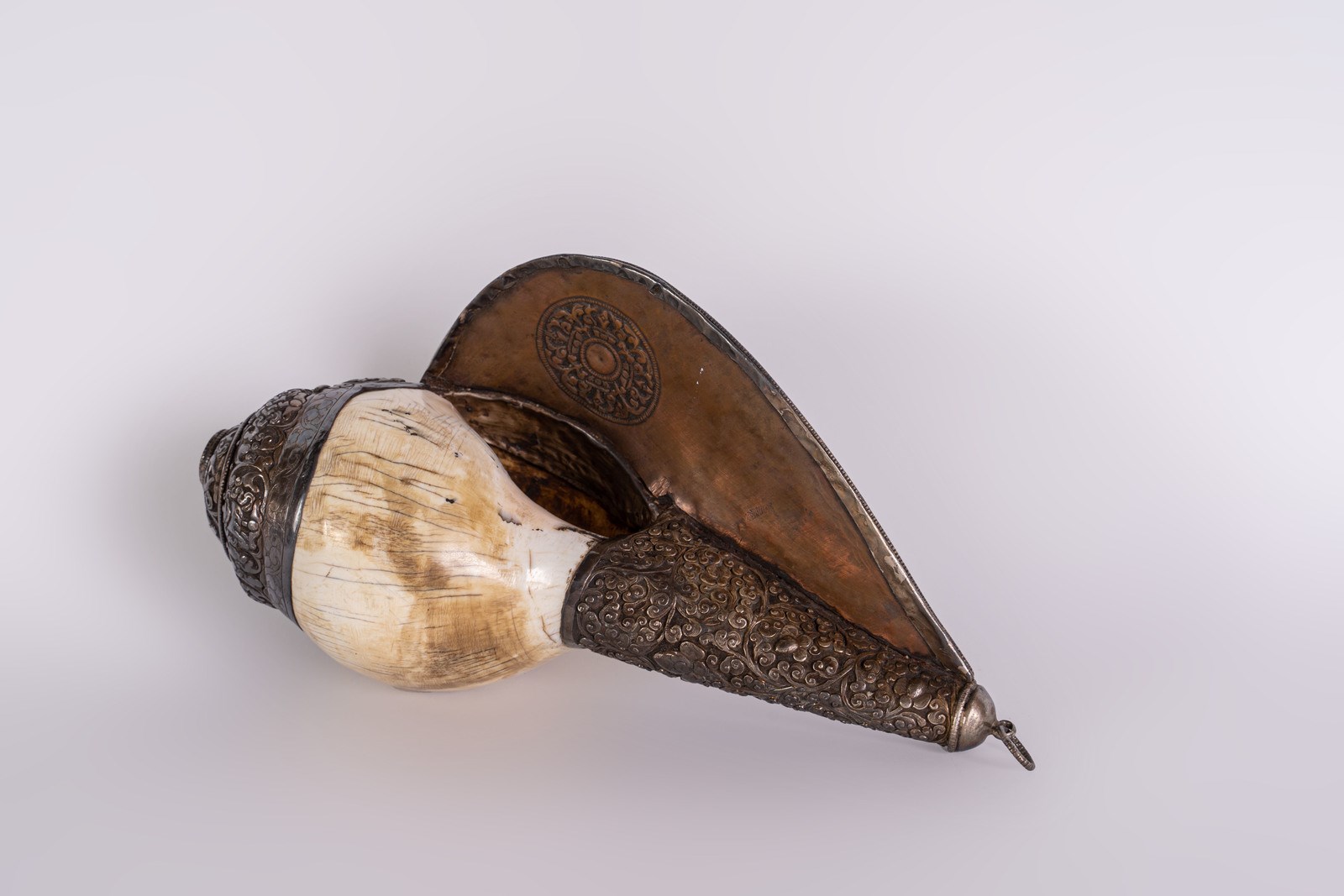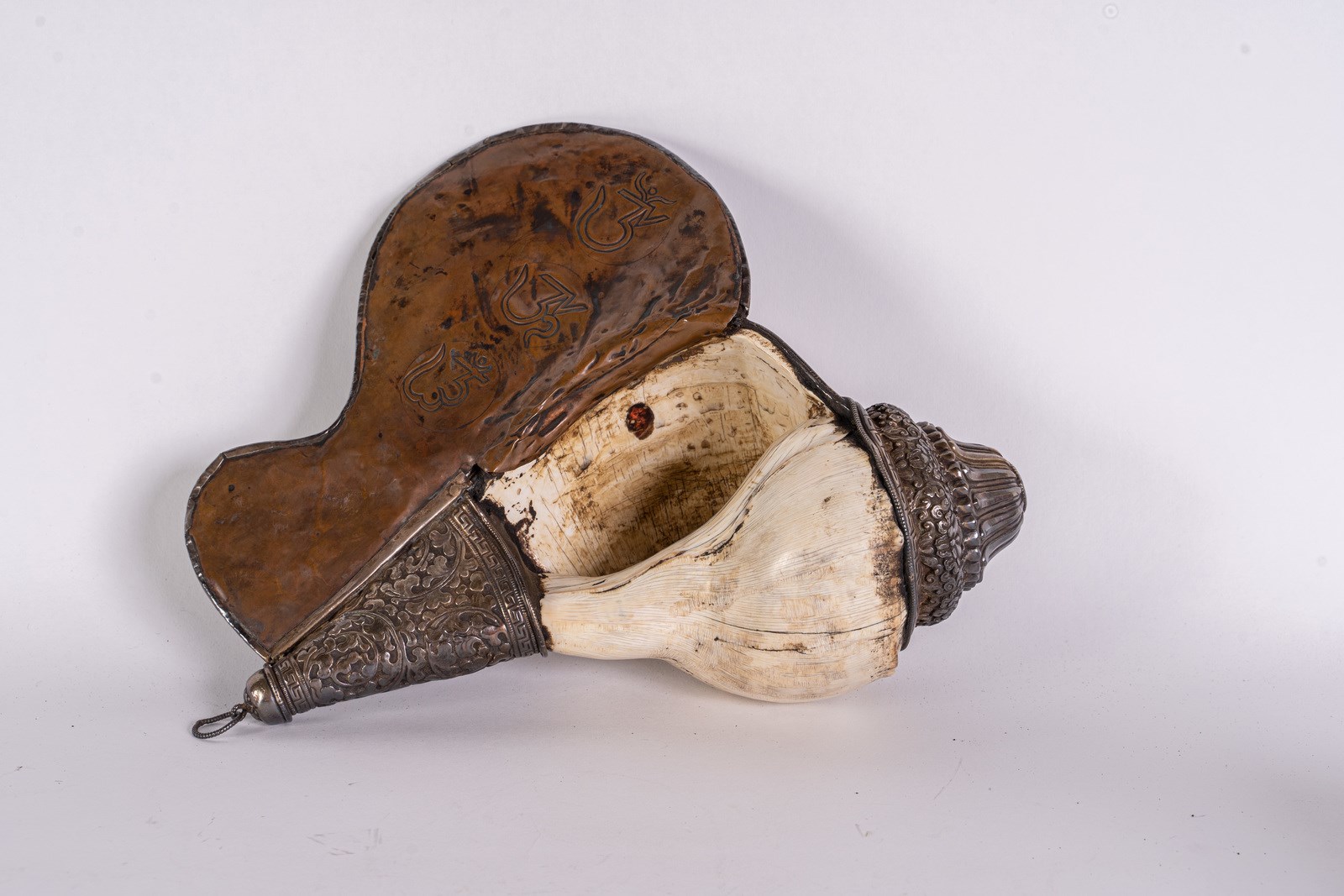 Oggetto rituale decorato con banda in metallo argentato sbalzato con quattro animali tra volute floreali. Tra gli animali si distinguono un elefante, un volatile ed una scimmia. Rifinito con piccoli coralli e turchesi incastonati. simbolo sbalzato su retro.