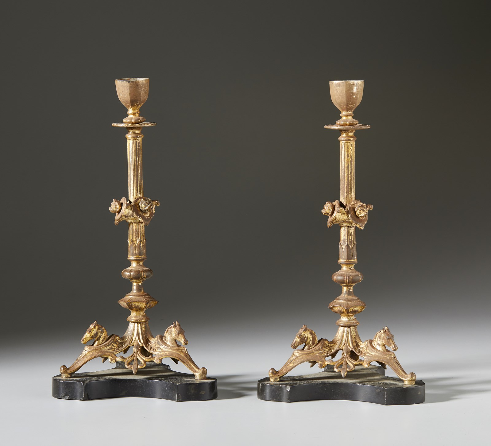 Due candelieri in bronzo dorato realizzati nello stile eclettico in voga nei primi anni del XX secol e caratterizzati da motivi decorativi zoomorfi