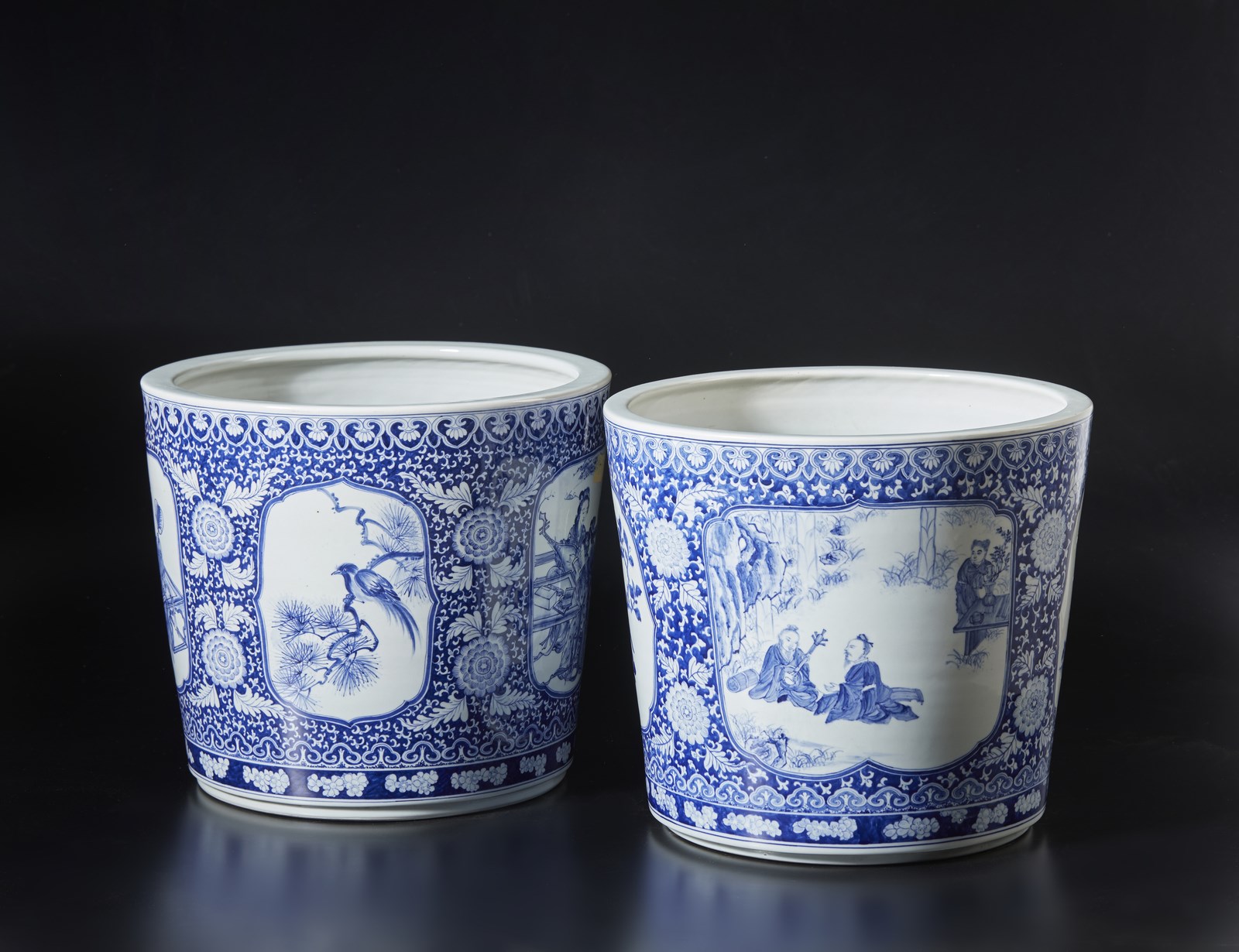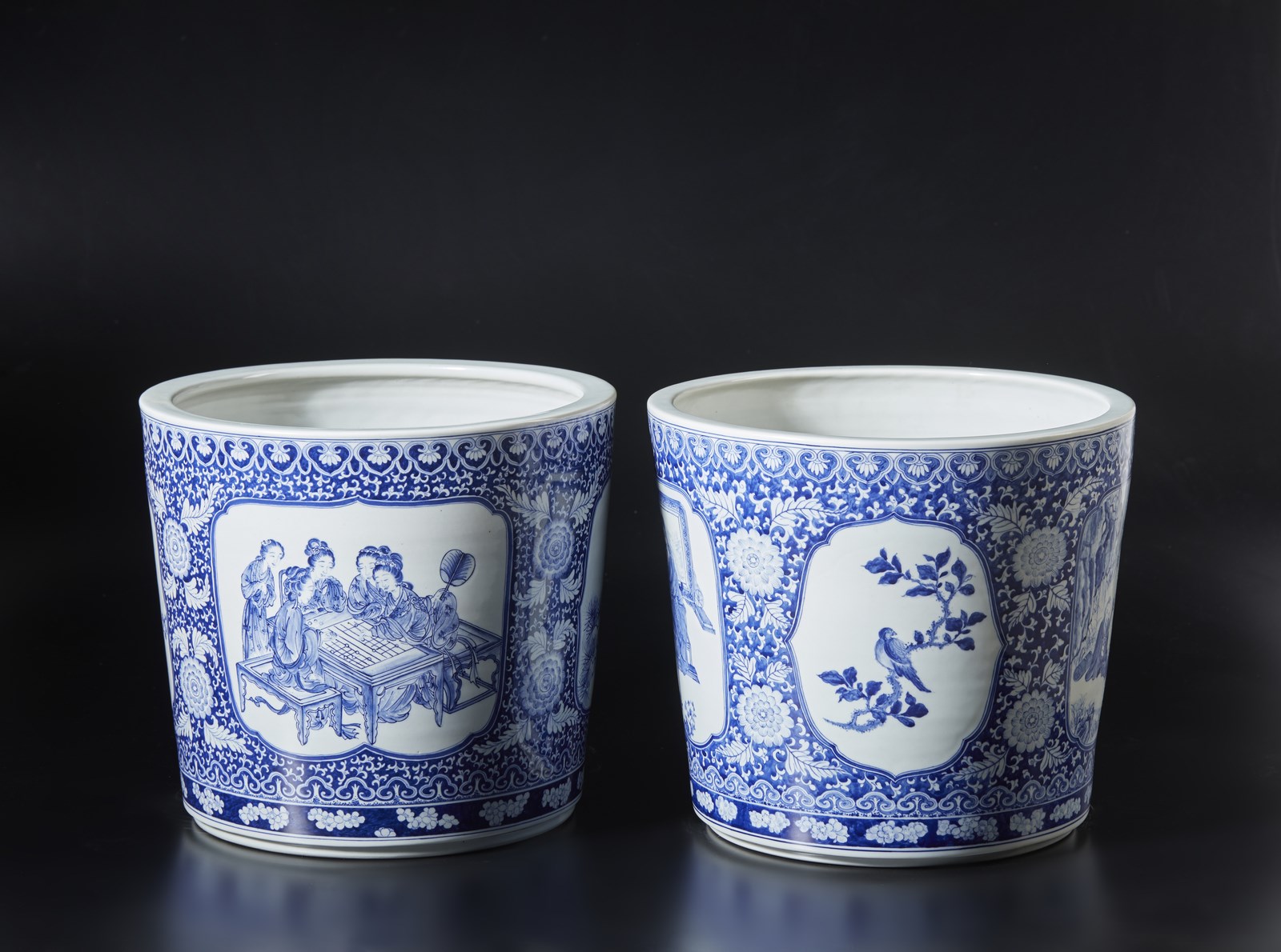 Coppia di vasi in porcellana a pasta spessa e sezione quasi cilindrica, l'esterno finemente decorato con scene cortesi e letterati entro riserve polilobate, a loro volta poggianti sfondo con tralci e fiori in riserva su blu.