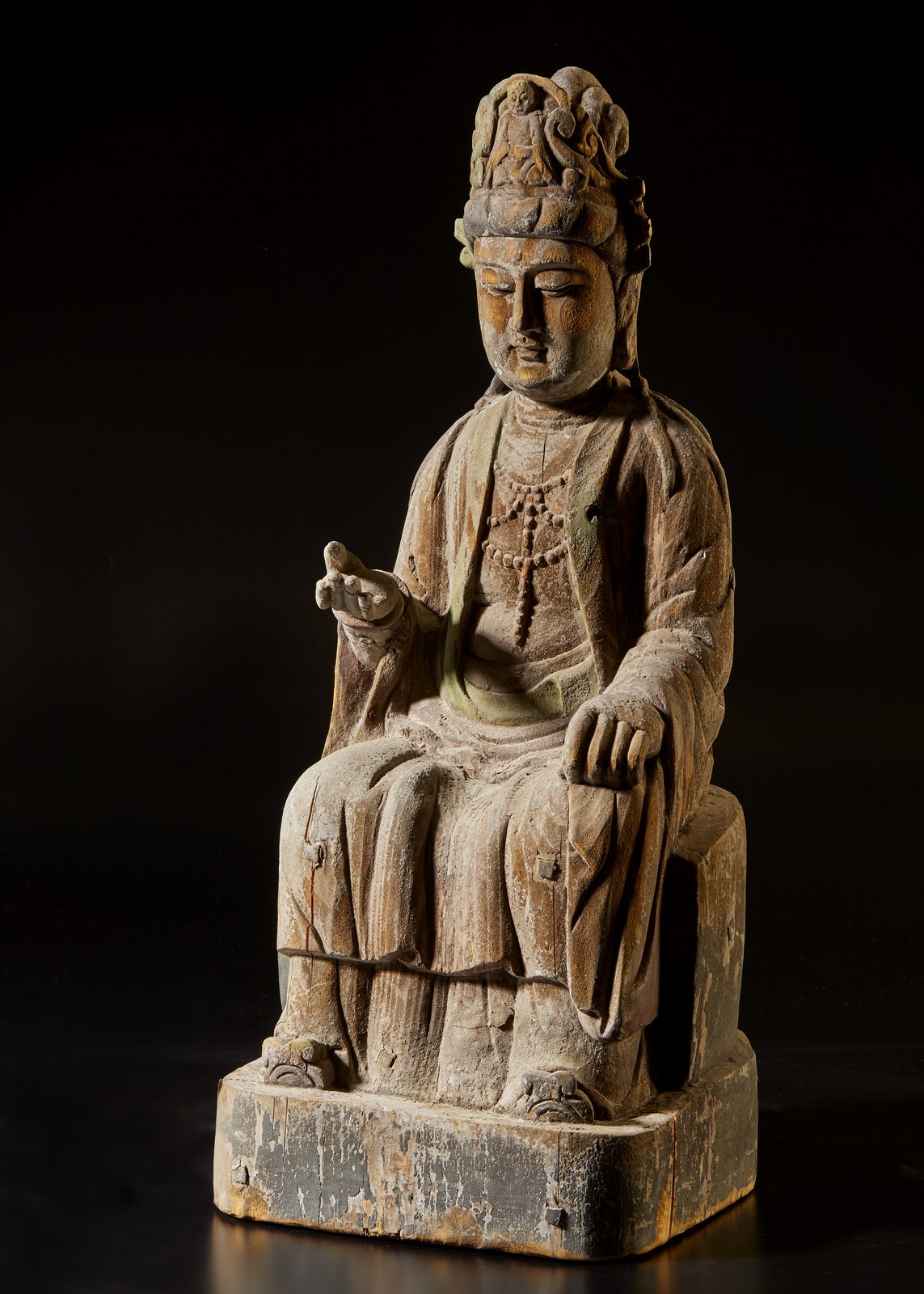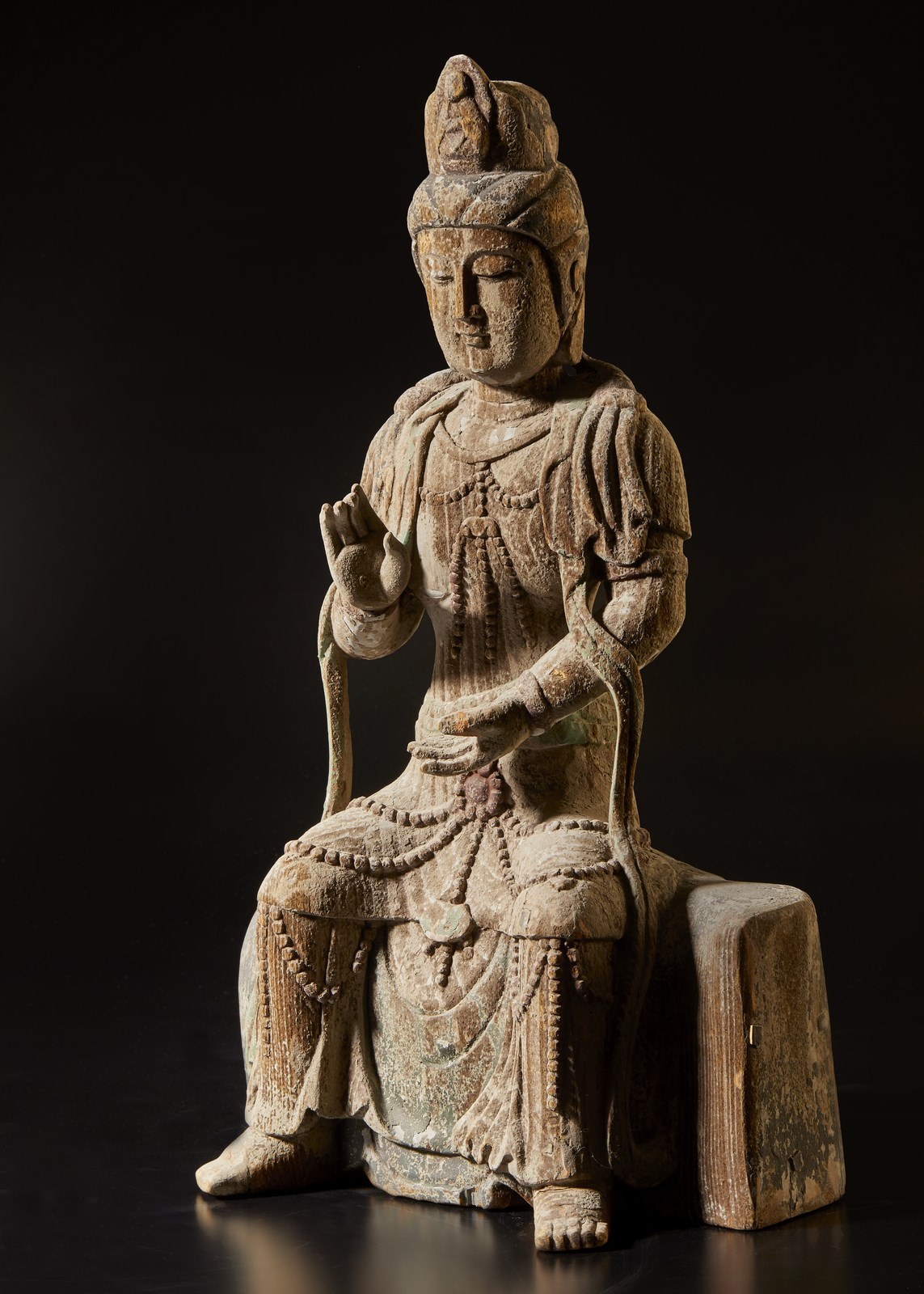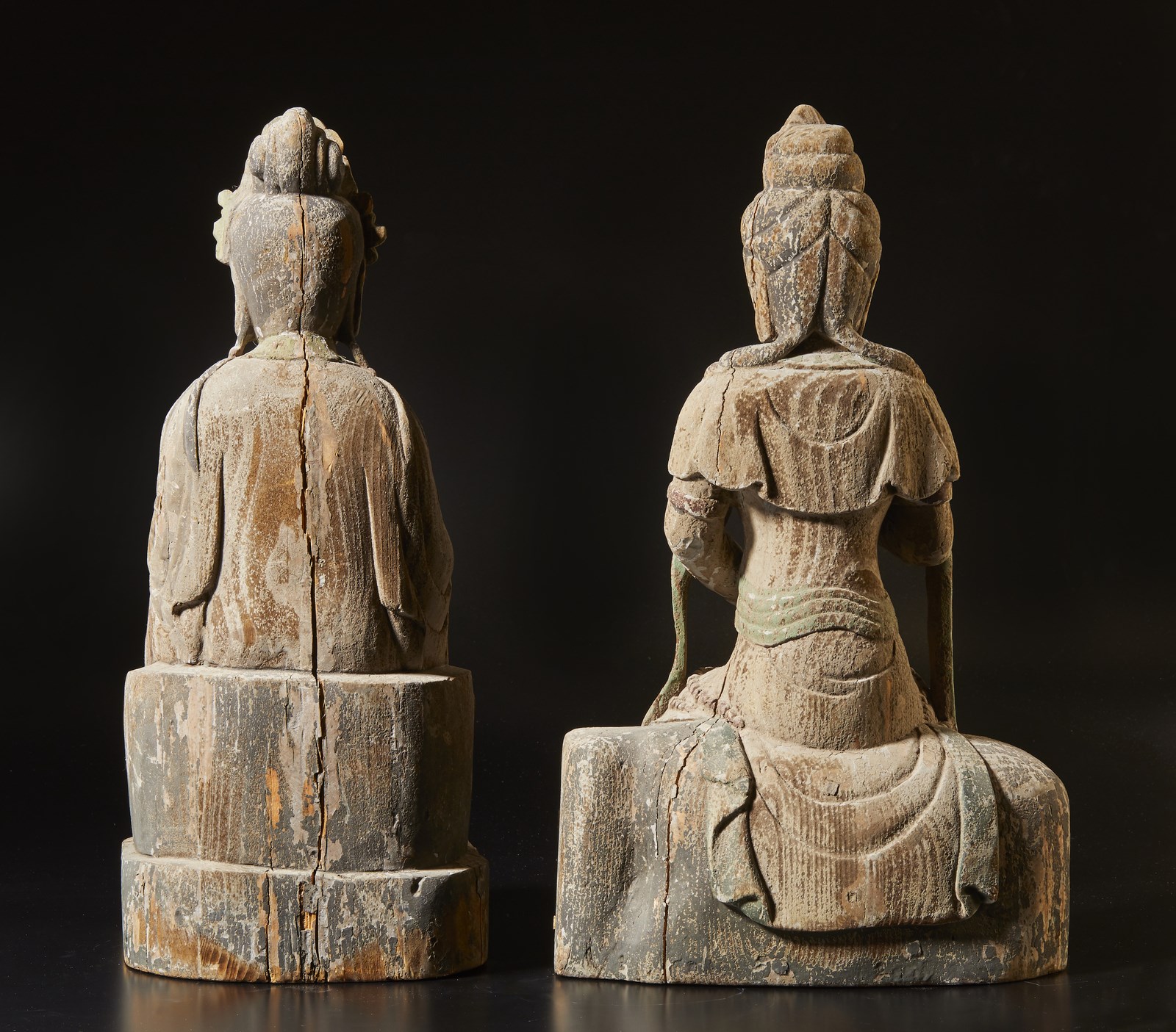 Coppia di raffigurazioni del bodhisattva della compassione in postura seduta e contraddistinte da diversi mudra delle mani.Tracce di policromia.