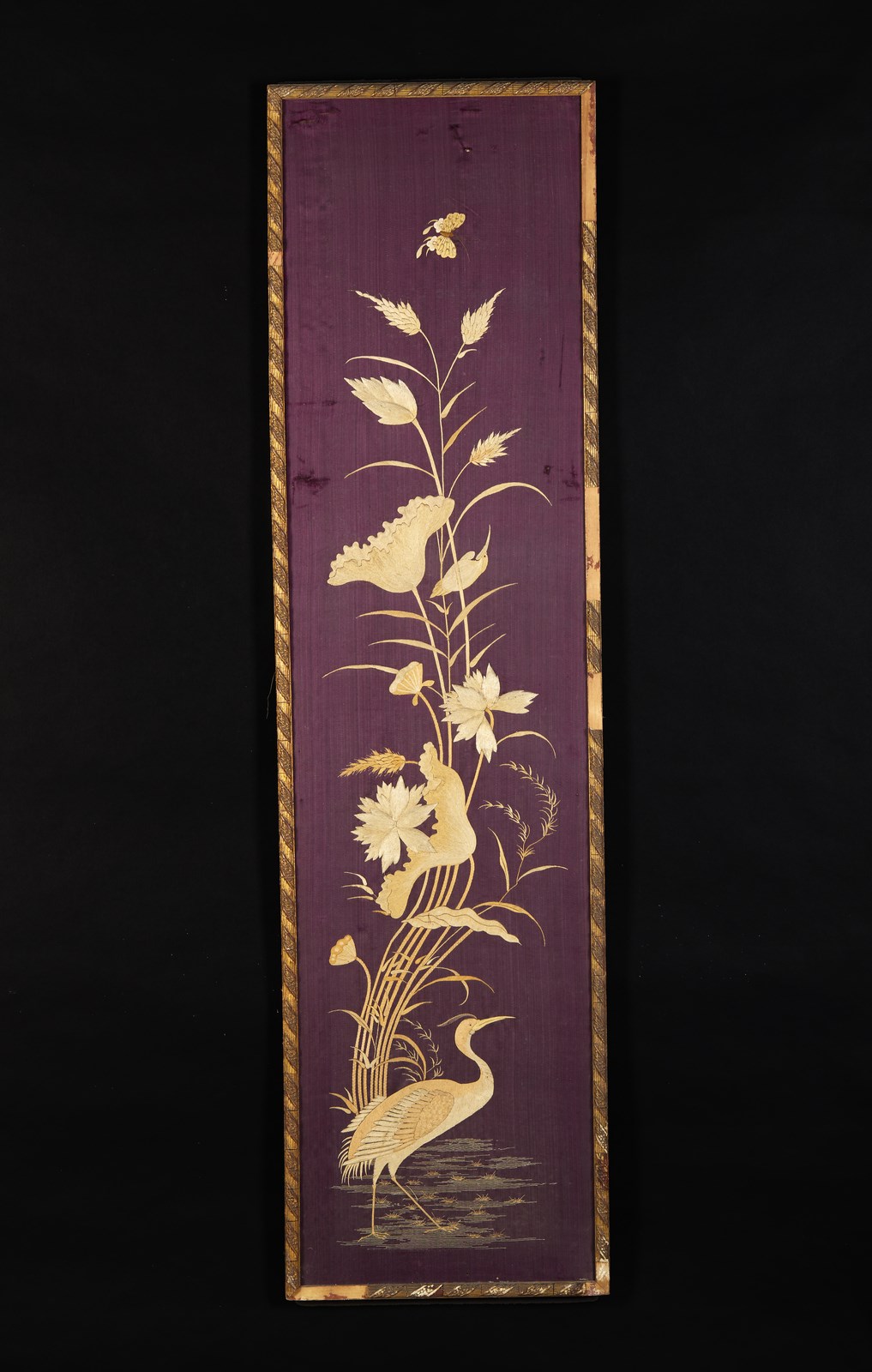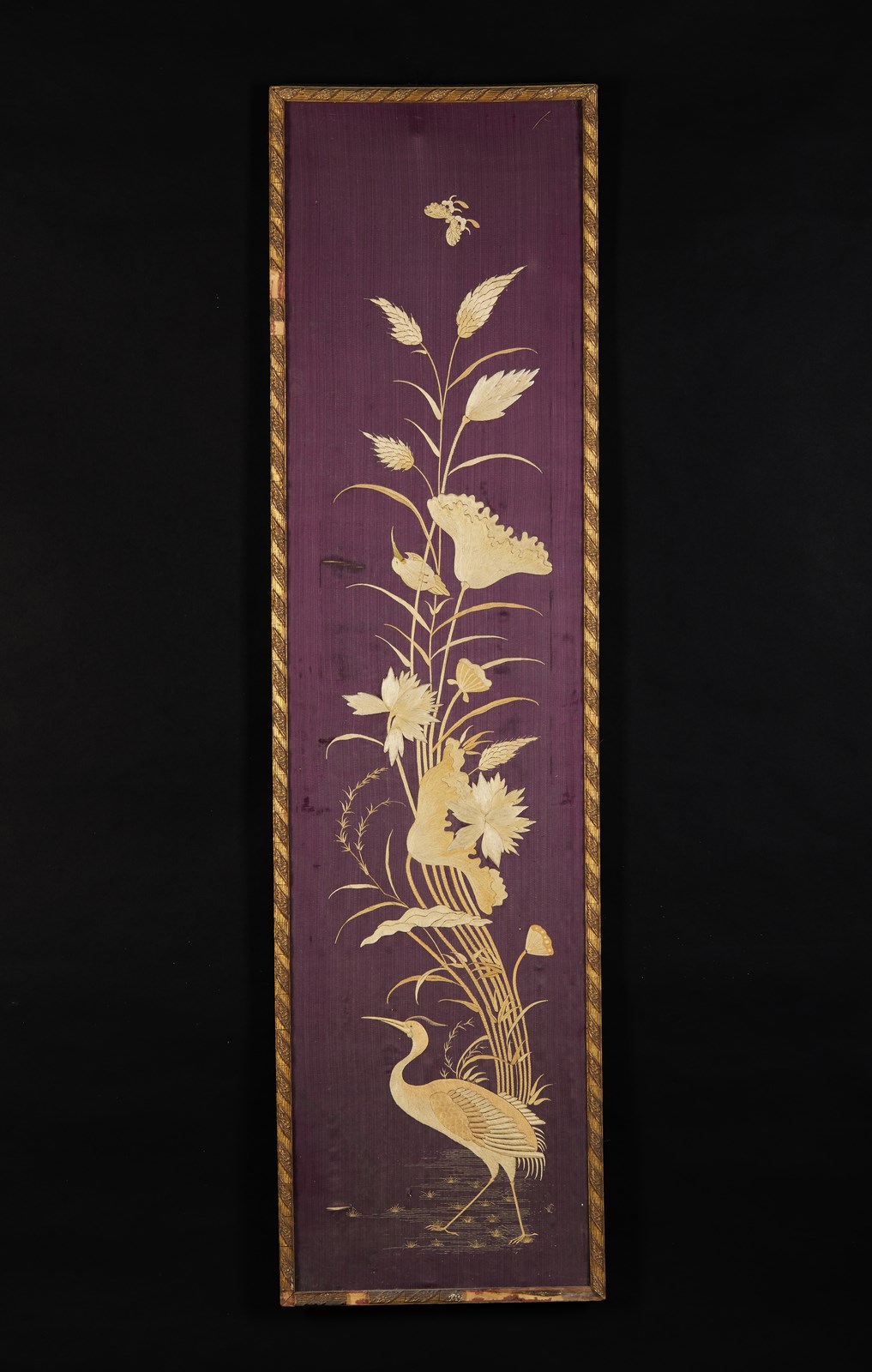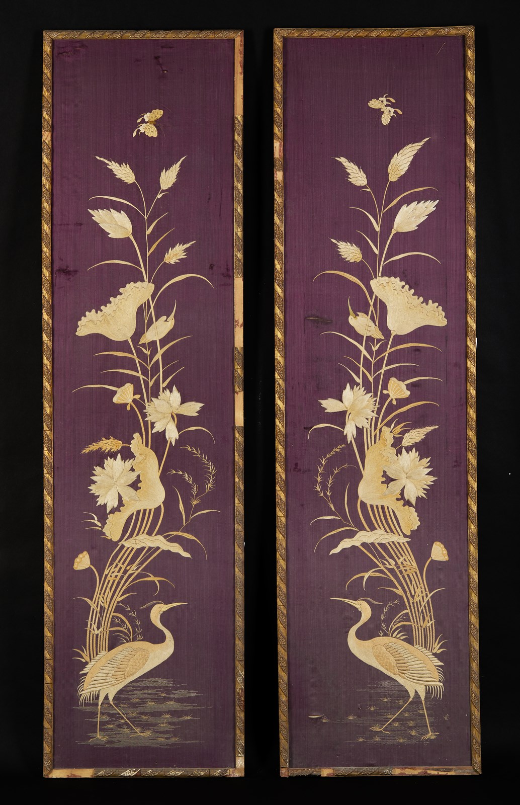 Coppia di pannelli verticali con decoro a ricamo in seta di piante palustri e aironi.