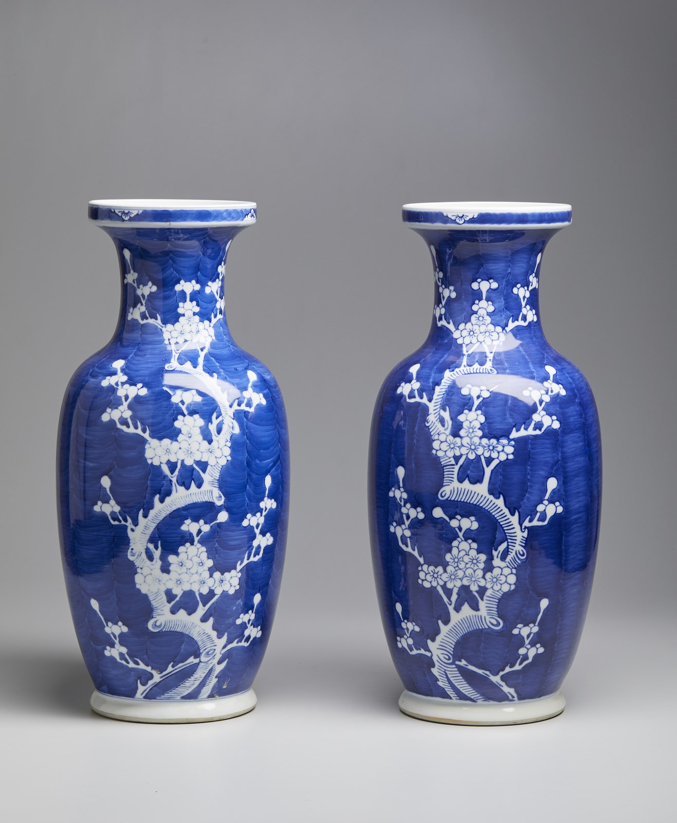 Due vasi a balaustro con decoro di rami di pesco in fiore su fondo blu.