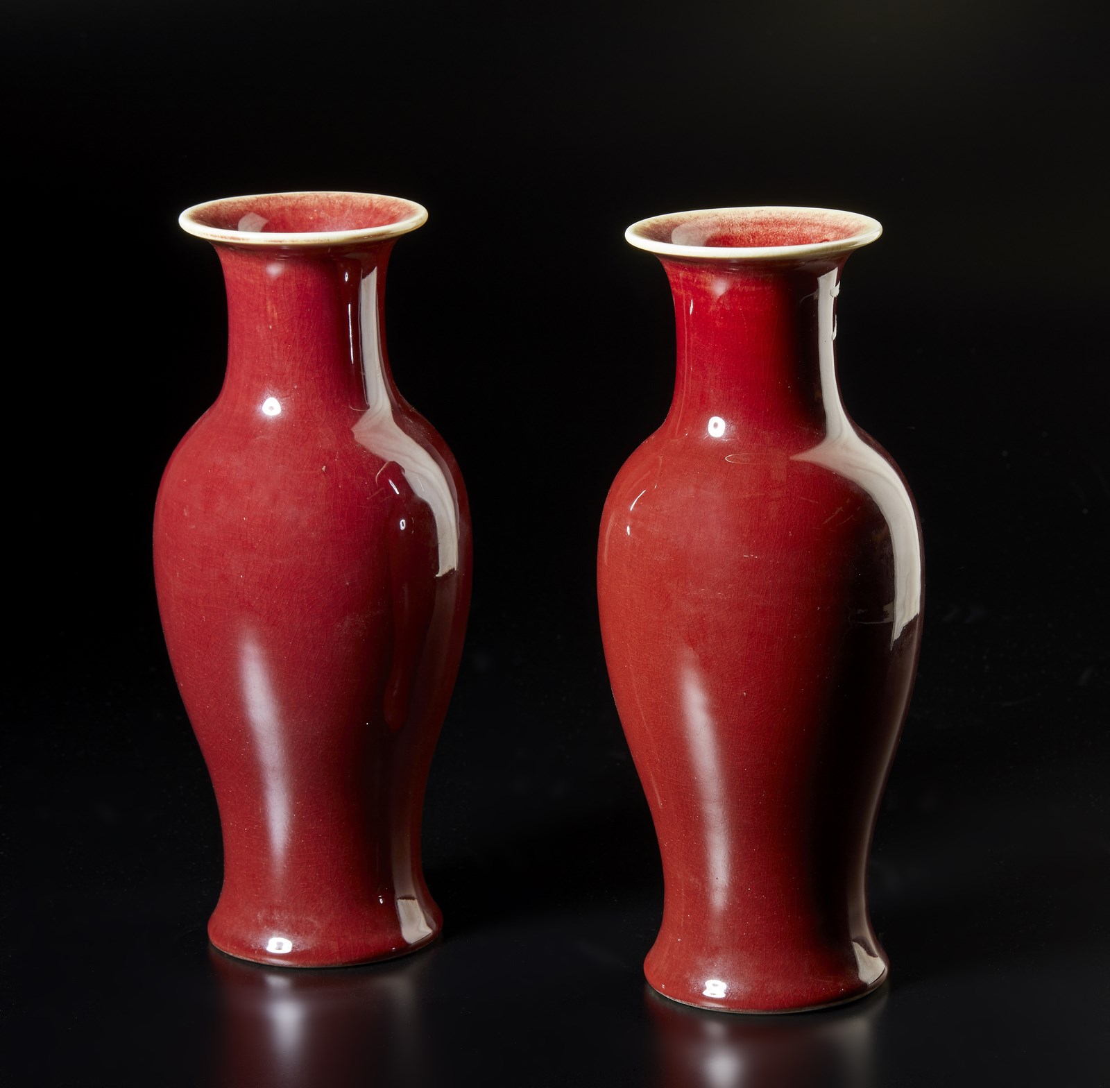 Coppia di vasi a balaustro in porcellana pesante con invetriatura monocroma rossa