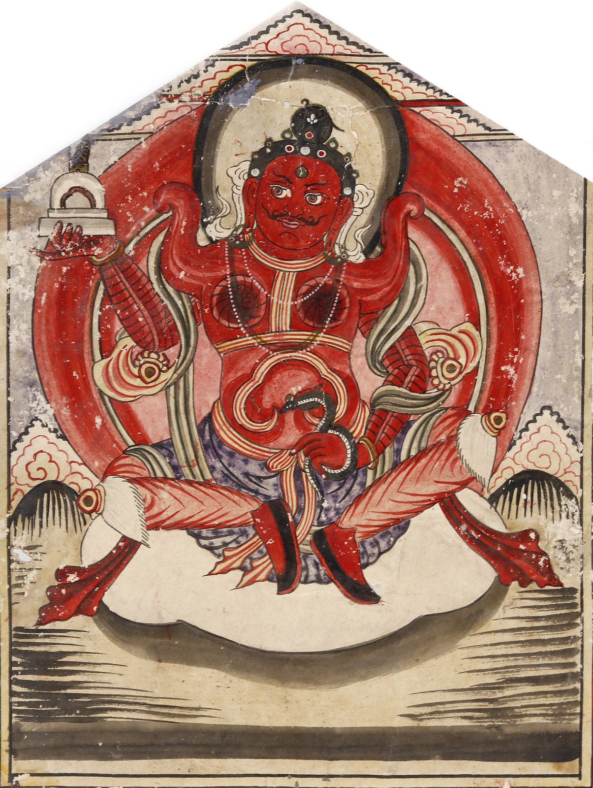 Piccolo dipinto policromo su carta raffigurante uno dei quattro Lokapala, il guardiano dell'Ovest Virupaksha seduto in rajalilasana. La figura reca nella sua mano destra una stupa, nella sinistra un serpente.