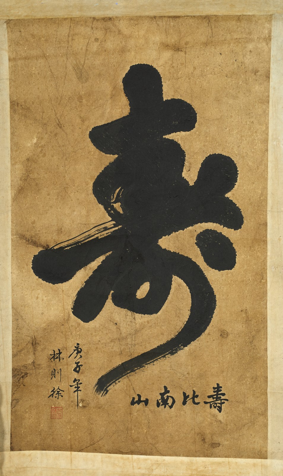 Lotto composto da due rotoli su carta: uno dipinto ad inchiostro in stile calligrafico con grande ideogramma, l'altro raffigurante grande immagine di Kuanyin stante (124 X 45 cm / totale 130 X 56 cm).