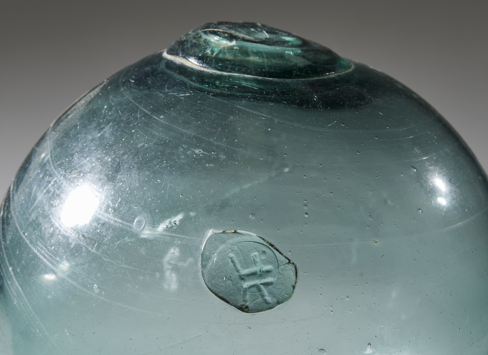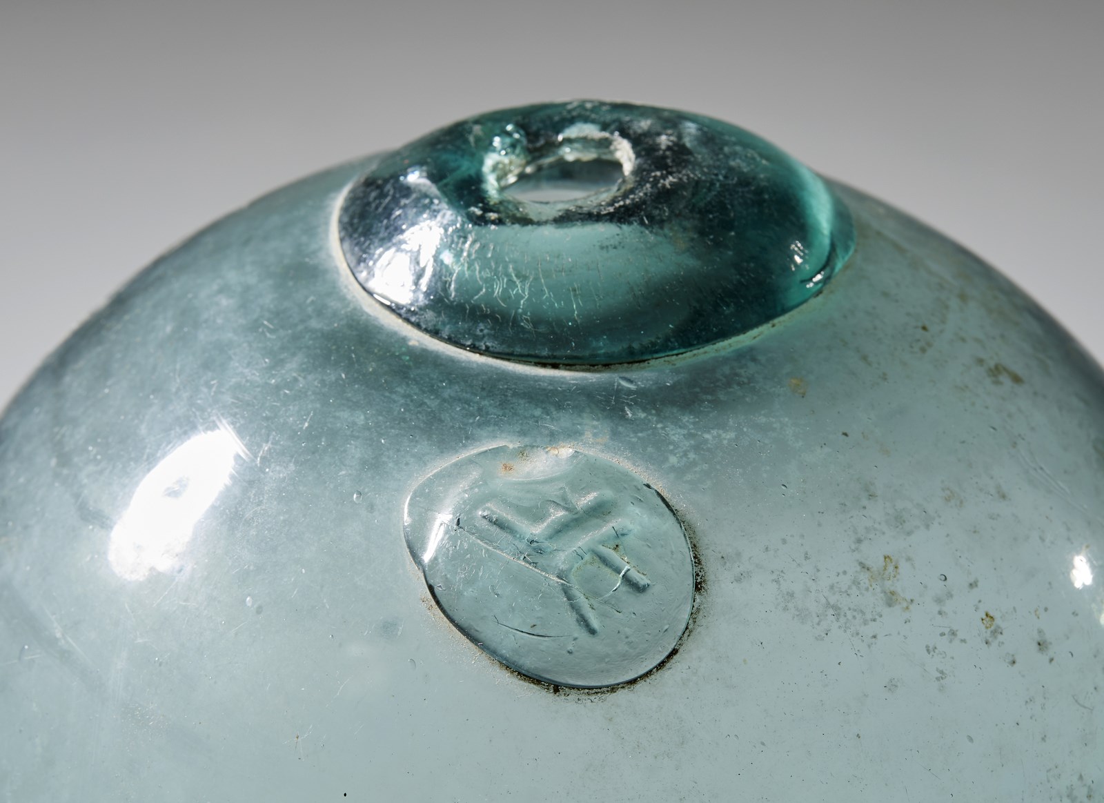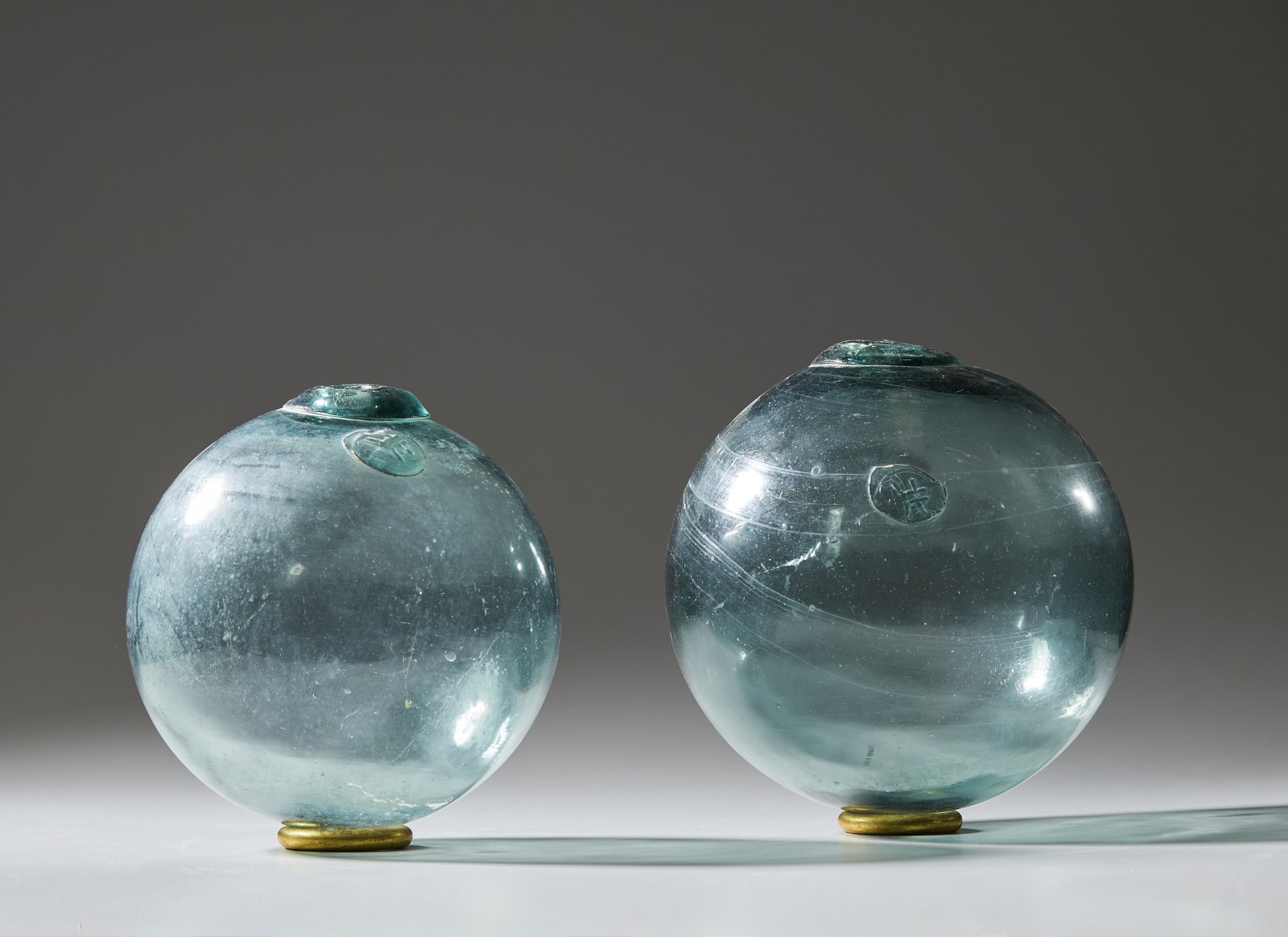 Coppia di galleggianti di forma sferica in vetro soffiato.
