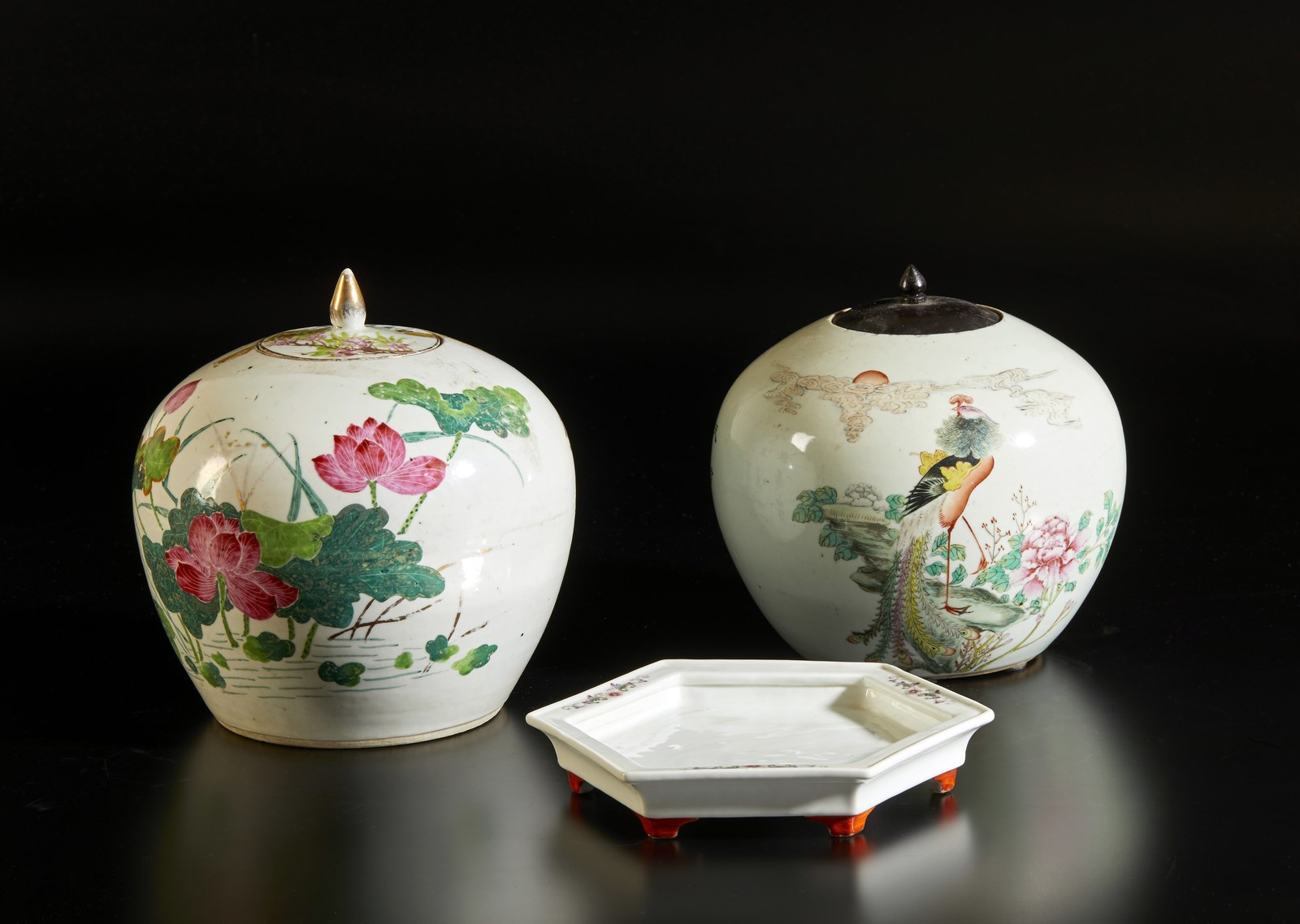 Due potiches famiglia rosa e vassoio esagonale in porcellana Cina, XIX - inizio [..]