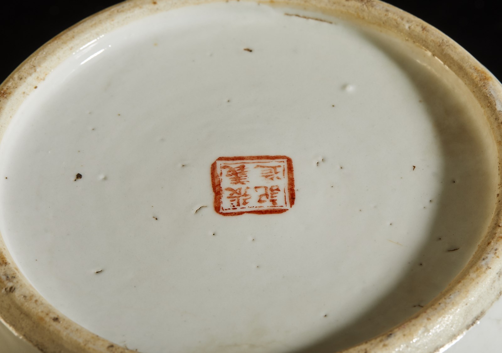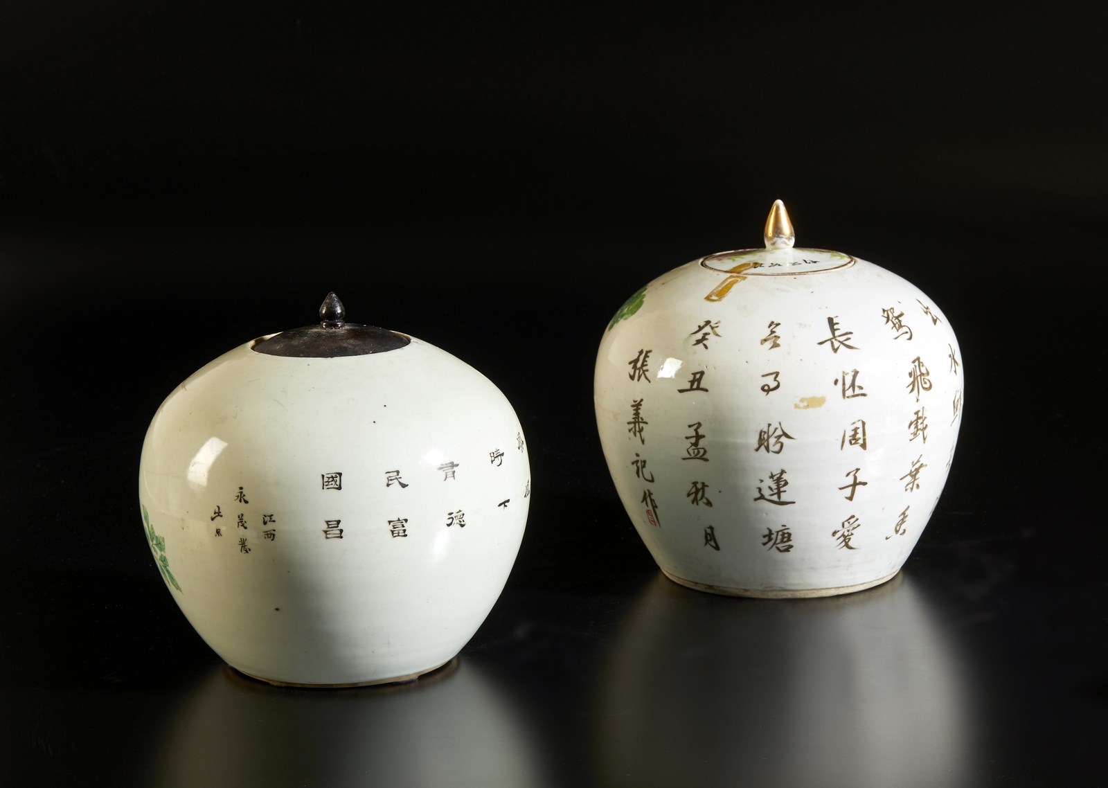 Coppia di potiches globulari con coperchio circolare. l'esterno dipinto con uccelli o motivi floreali e iscrizioni. il vassoio con sobria decorazione di tralci vegetali sul bordo e marchio a sigillo Qianlong in rosso sulla base.