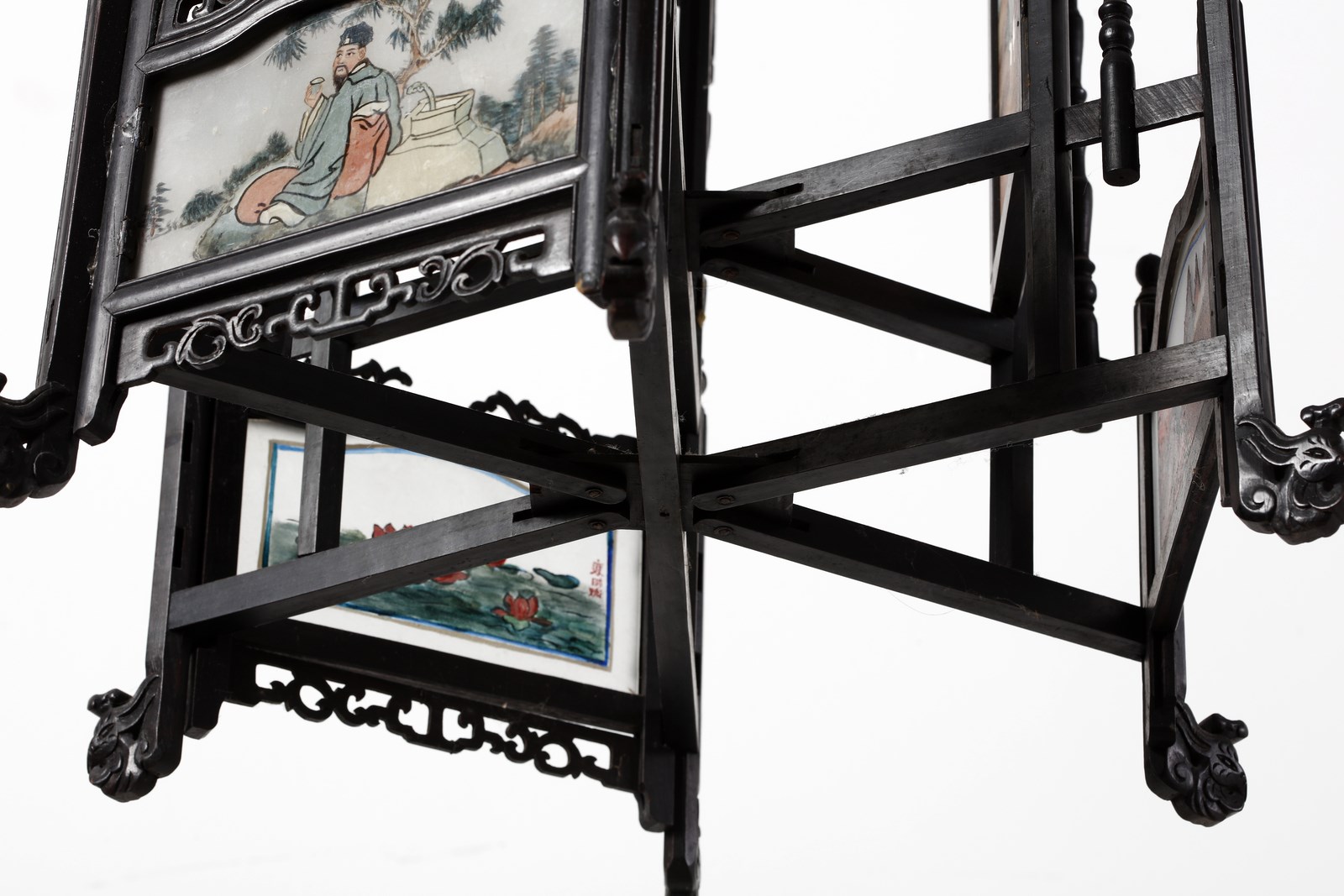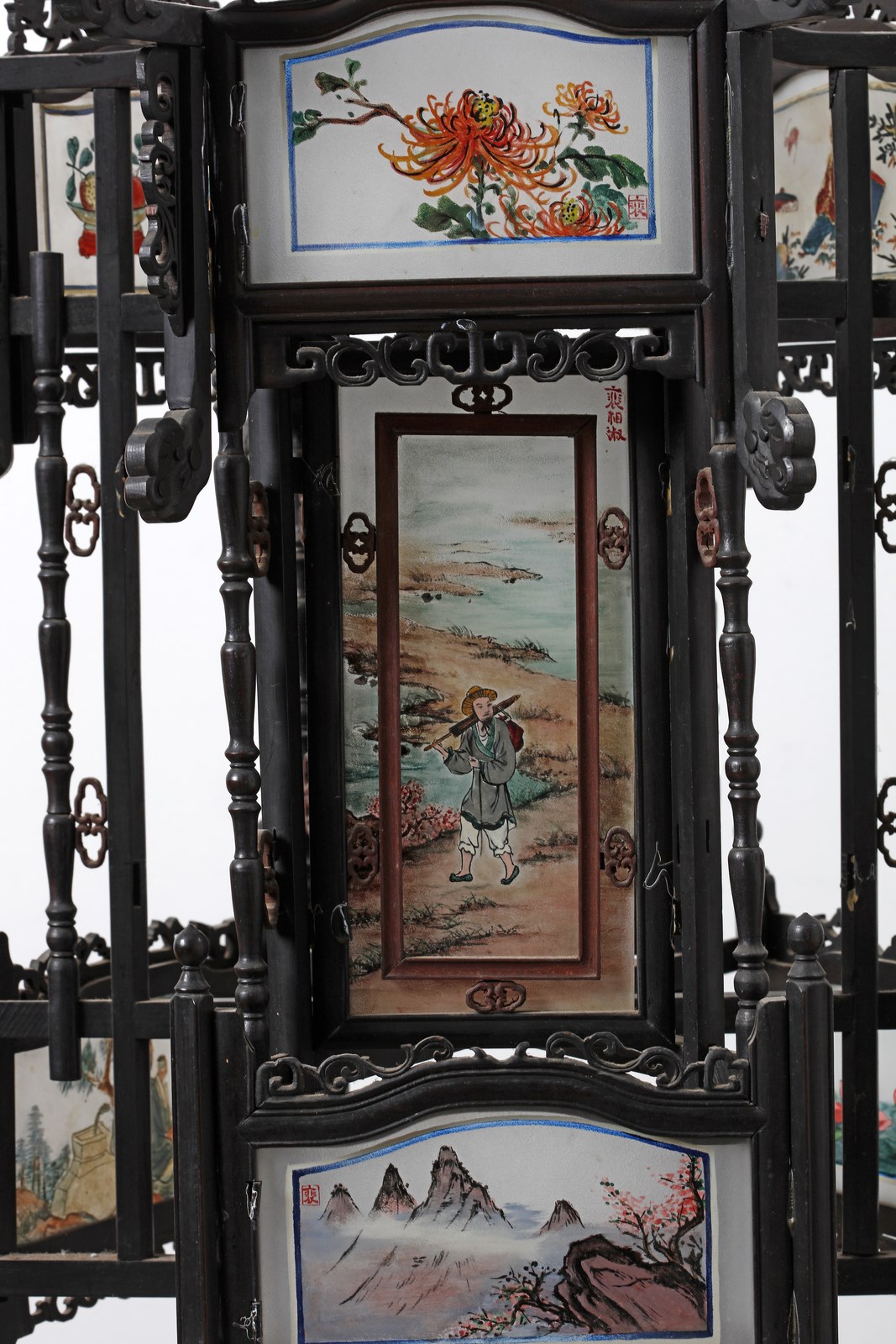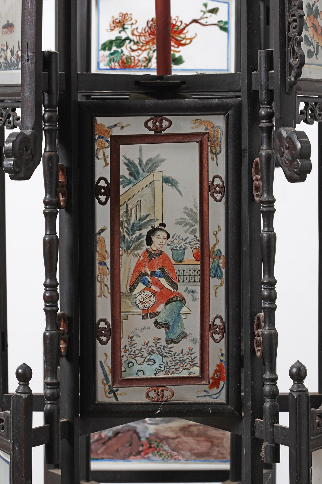 Grande apparato per illuminazione corredato di pannelli pieghevoli in legno decorato con profili traforati e placche in vetro dipinto con personaggi e motivi floreali. Incompleta.