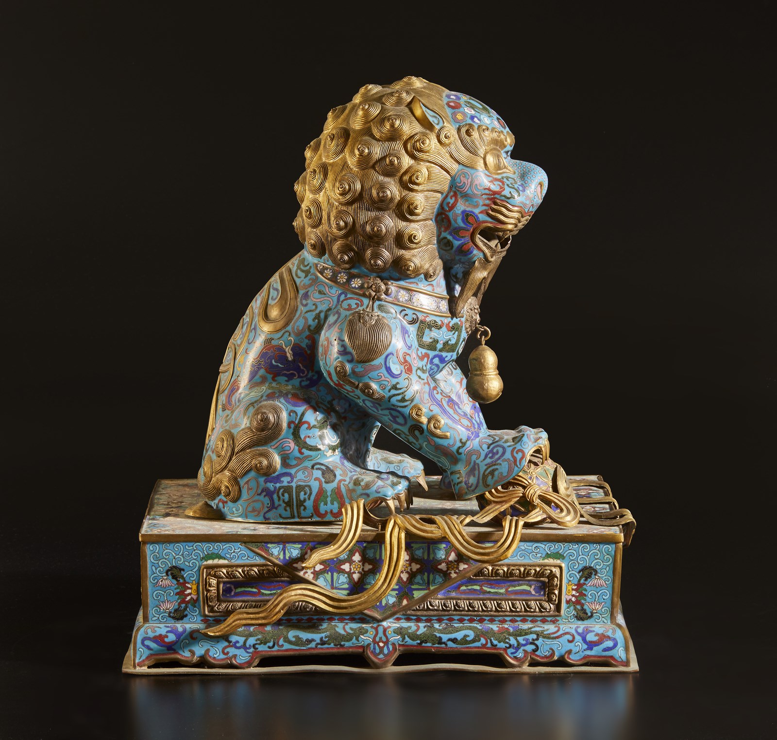 Grande figura di leone buddista seduto su plinto rettangolare, in metallo decorato con smalti cloisonnè.