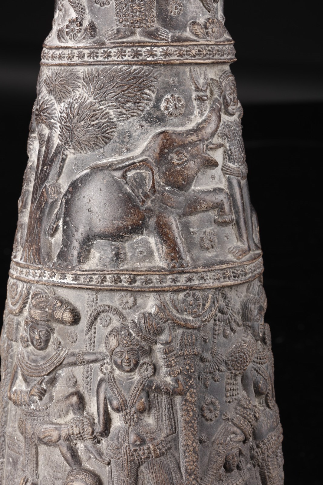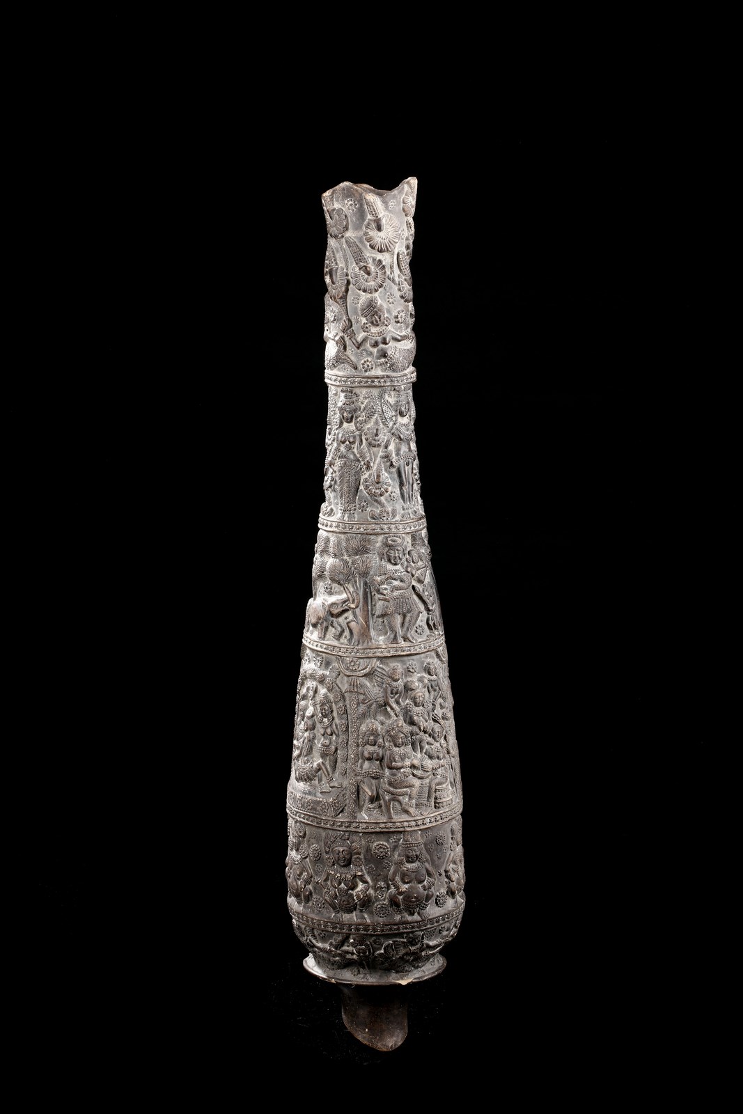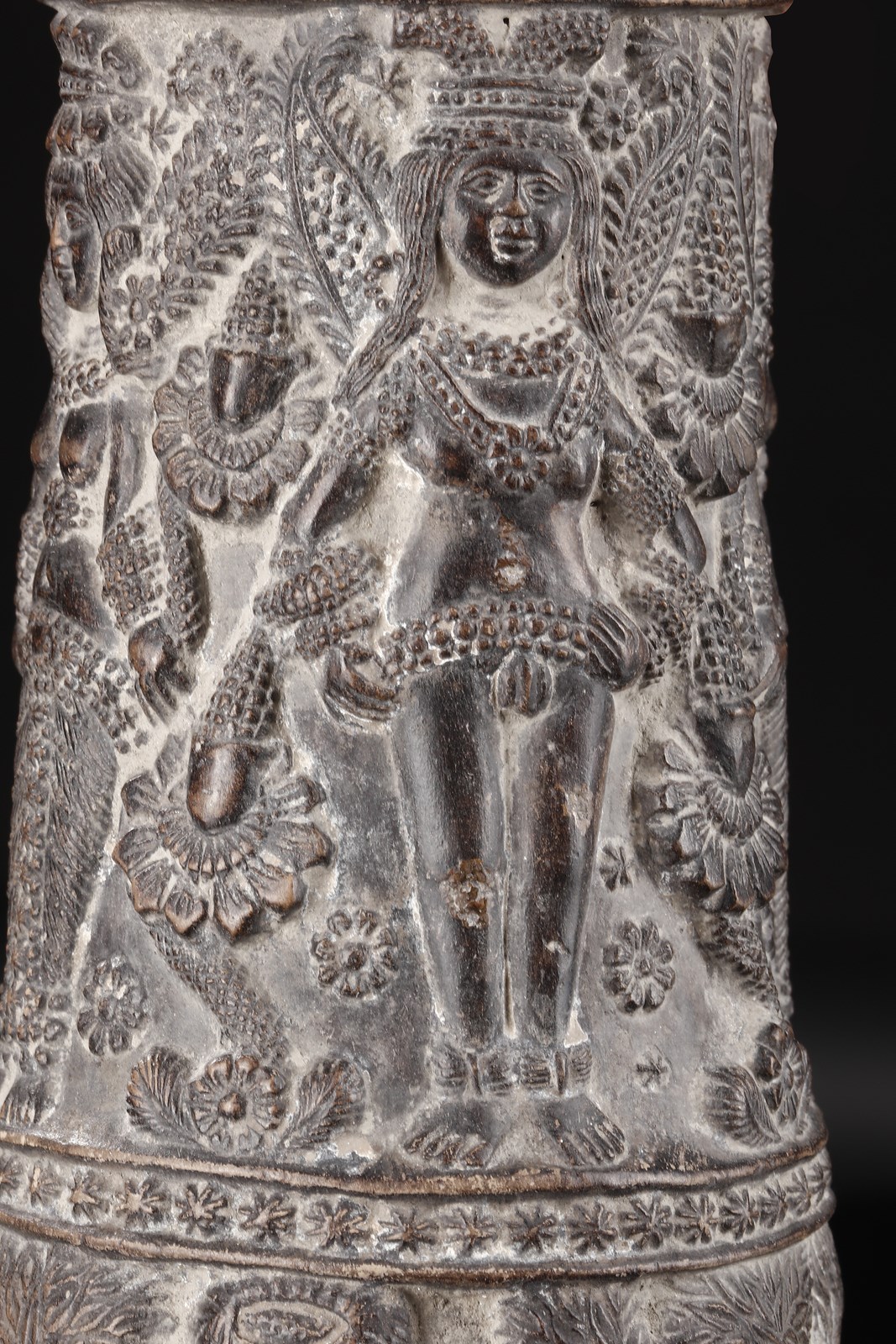 Vaso dal corpo globulare e lungo stelo cilindrico finemente modellato con decorazione arrangiata in sei registri sovrimposti separati da sottili fasce contenenti piccoli fiori simili a stelle. La composizione è allegra e gioviale, con una moltitudine di Yakshini immerse nella natura, tra tralci, fiori e alberi. Base e bocca mancanti. Lotto corredato di test termoluminescenza.