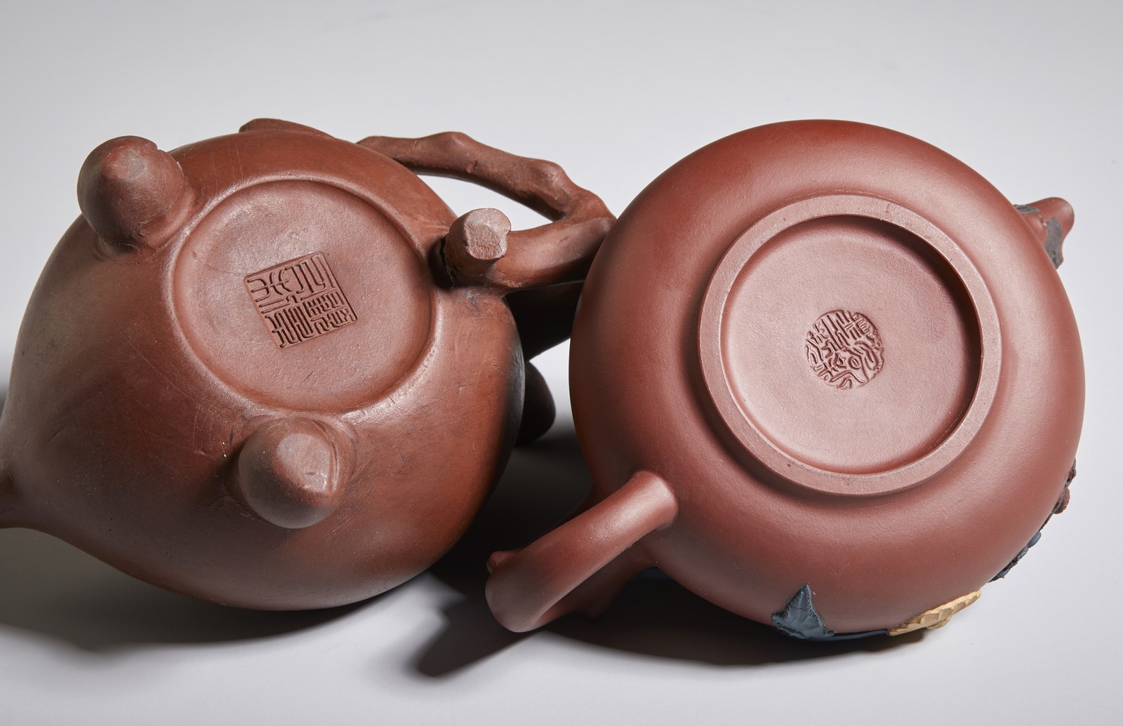 Include: due teiere con decorazione floreale in rilievo, due teiere a forma di citrus hand ed una teiera in forma vegetale decorata con rilievi fitomorfi. Tutte le teiere mostrano marchi impressi. La più grande ha le misure indicate.