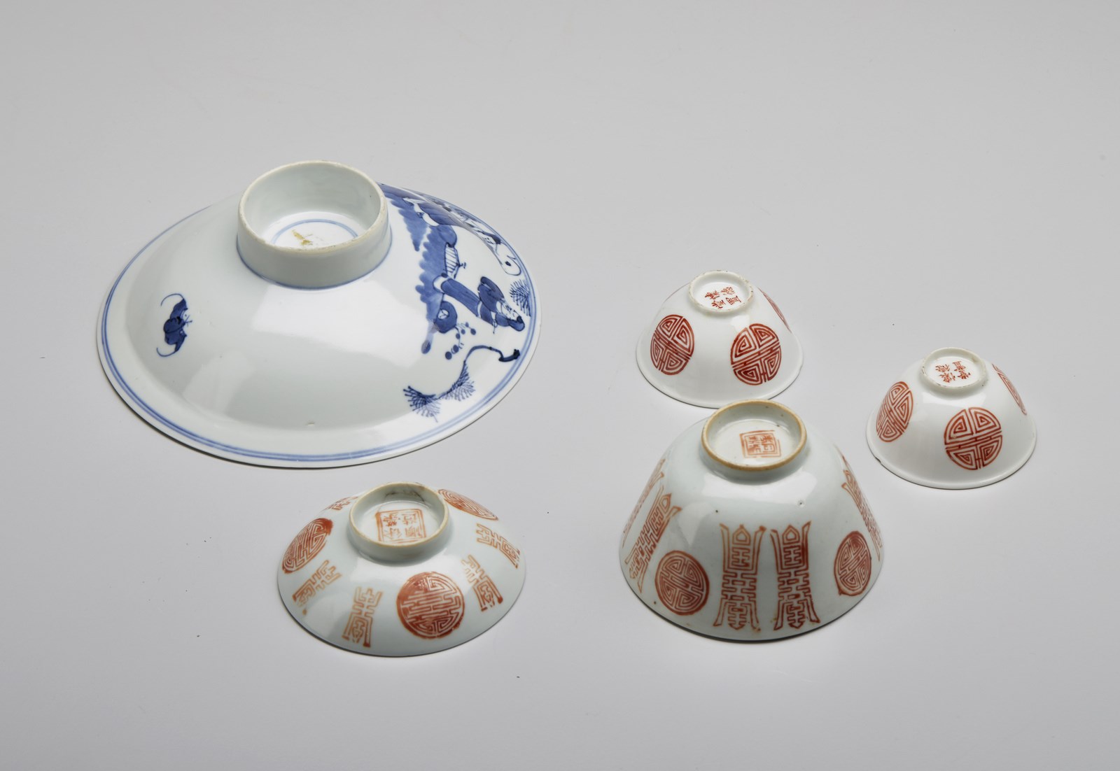 Include: una ciotola poggiante su alto piede e ricoperta di invetriatura beige (h. 9 X 18 cm). Una tazza (5,5 X 10 cm) con coperchio e due bicchieri in porcellana bianca decorata con ideogrammi rossi Una tazza su piede circolare dipinta con personaggi in blu sottocoperta (h.6 X 18 cm) Un incensiere ricoperto di invetriatura celadon (h. 6,7 X 23,2 cm)